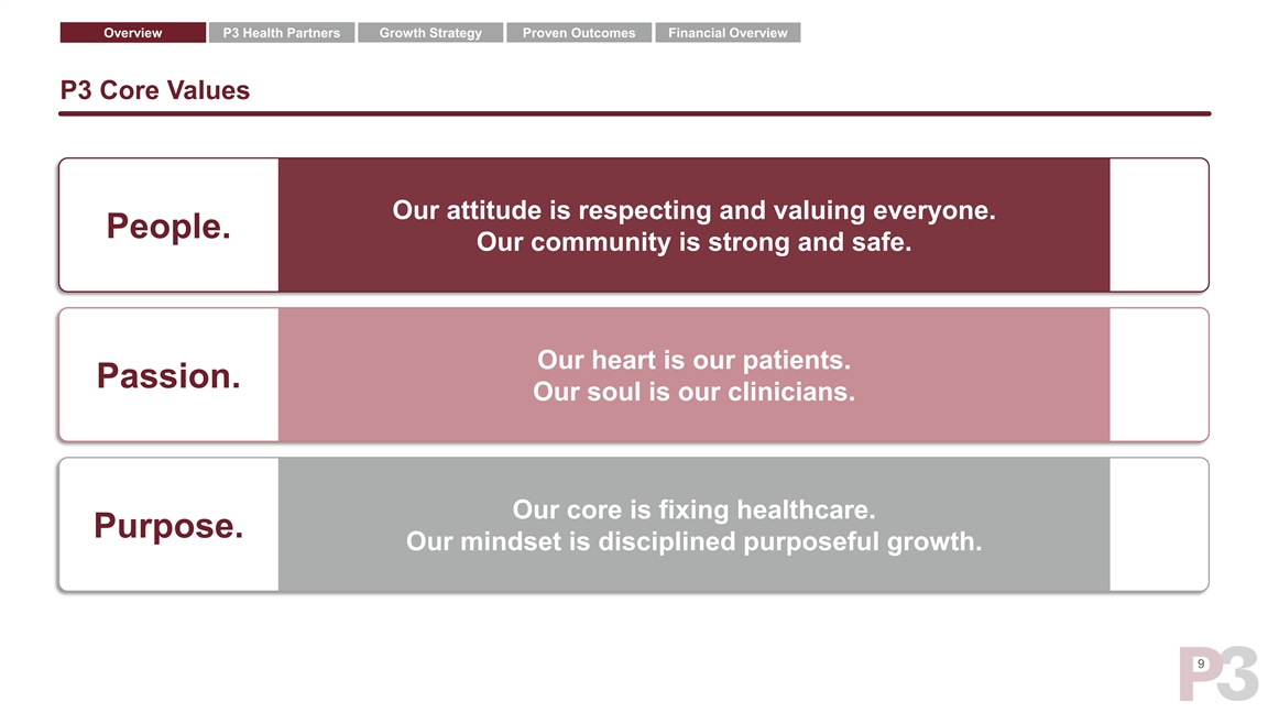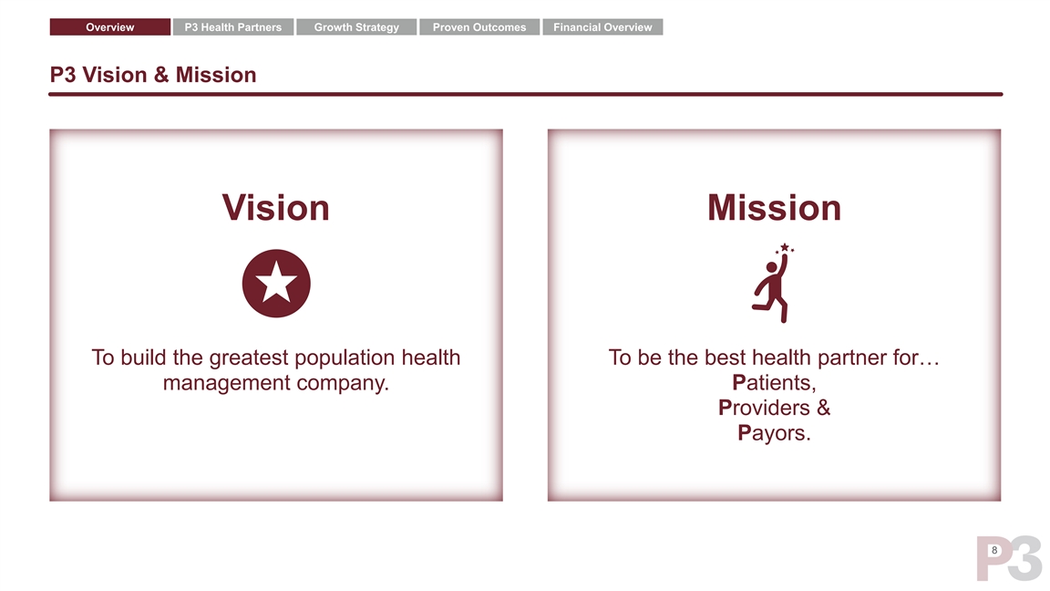 Overview P3 Health Partners Growth Strategy Proven Outcomes Financial Overview P3 Vision & Mission Vision Mission To build the greatest population health To be the best health partner for… management company. Patients, Providers & Payors. 8Overview P3 Health Partners Growth Strategy Proven Outcomes Financial Overview P3 Vision & Mission Vision Mission To build the greatest population health To be the best health partner for… management company. Patients, Providers & Payors. 8