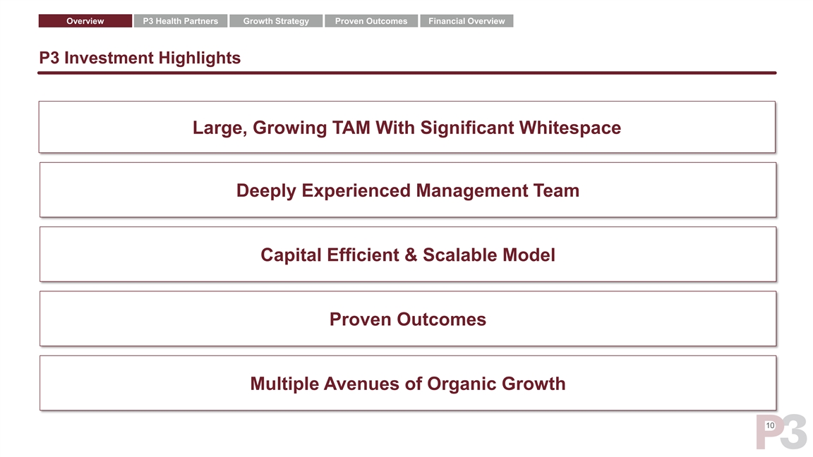 Overview P3 Health Partners Growth Strategy Proven Outcomes Financial Overview P3 Core Values Our attitude is respecting and valuing everyone. People. Our community is strong and safe. Our heart is our patients. Passion. Our soul is our clinicians. Our core is fixing healthcare. Purpose. Our mindset is disciplined purposeful growth. 9