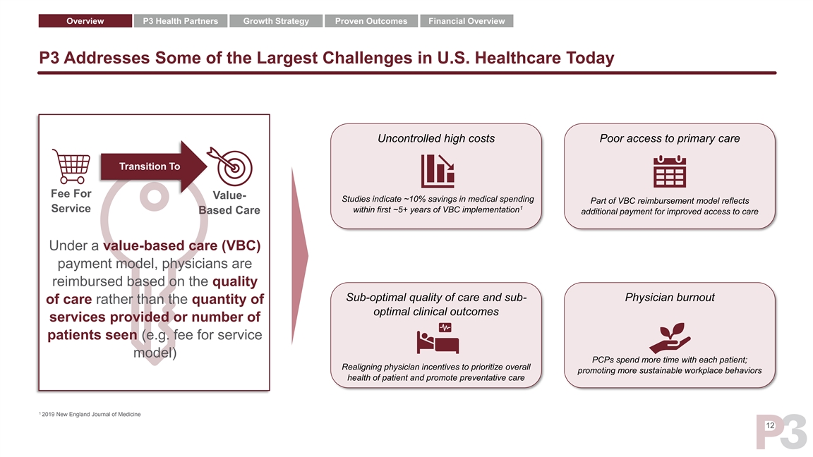 Overview P3 Health Partners Growth Strategy Proven Outcomes Financial Overview U.S. Healthcare Facing Significant Challenges Uncontrolled high costs Poor access to primary care 5.4% $3.8T 25% Project healthcare US spending on Americans do not have access to 1 spending growth healthcare (2019) 2 essential primary care 1 (2019 to 2028) Sub-optimal quality of care and sub- Physician burnout optimal clinical outcomes 50%+ 40% of PCPs show signs of burnout and report 4 of Americans have 2+ chronic conditions; feeling unfairly compensated 3 Comparable developed nations average ~17.5% 1 2 3 4 2019 Medicare national healthcare expenditure, CMS; JAMA internal medicine; Multiple chronic conditions in the United States, RAND corporation; 2018 Physicians foundation report 11Overview P3 Health Partners Growth Strategy Proven Outcomes Financial Overview U.S. Healthcare Facing Significant Challenges Uncontrolled high costs Poor access to primary care 5.4% $3.8T 25% Project healthcare US spending on Americans do not have access to 1 spending growth healthcare (2019) 2 essential primary care 1 (2019 to 2028) Sub-optimal quality of care and sub- Physician burnout optimal clinical outcomes 50%+ 40% of PCPs show signs of burnout and report 4 of Americans have 2+ chronic conditions; feeling unfairly compensated 3 Comparable developed nations average ~17.5% 1 2 3 4 2019 Medicare national healthcare expenditure, CMS; JAMA internal medicine; Multiple chronic conditions in the United States, RAND corporation; 2018 Physicians foundation report 11