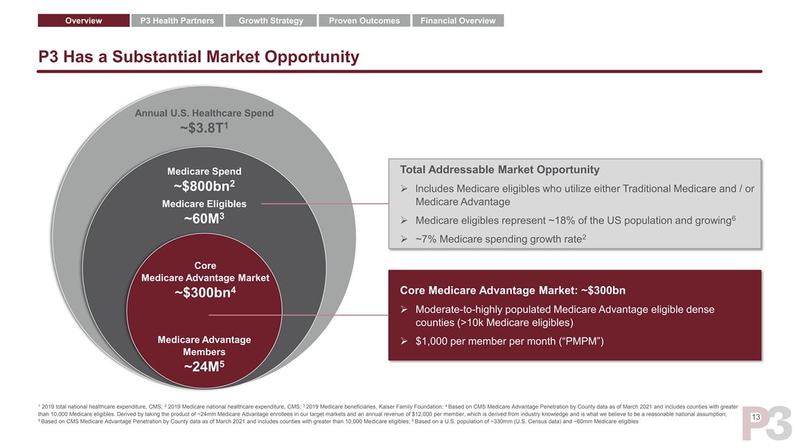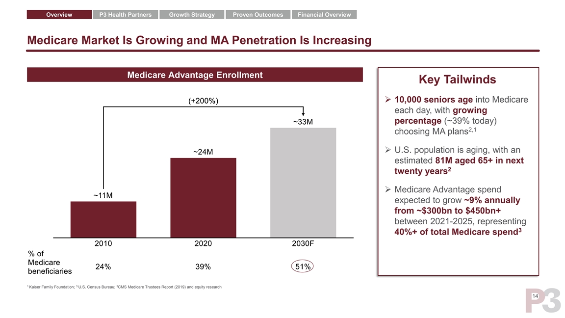 Overview P3 Health Partners Growth Strategy Proven Outcomes Financial Overview P3 Has a Substantial Market Opportunity Annual U.S. Healthcare Spend 1 ~$3.8T Total Addressable Market Opportunity Medicare Spend 2 ~$800bn ➢ lncludes Medicare eligibles who utilize either Traditional Medicare and / or Medicare Advantage Medicare Eligibles 3 6 ~60M ➢ Medicare eligibles represent ~18% of the US population and growing 2 ➢ ~7% Medicare spending growth rate Core Medicare Advantage Market 4 Core Medicare Advantage Market: ~$300bn ~$300bn ➢ Moderate-to-highly populated Medicare Advantage eligible dense counties (>10k Medicare eligibles) Medicare Advantage ➢ $1,000 per member per month (“PMPM”) Members 5 ~24M 1 2 3 4 2019 total national healthcare expenditure, CMS; 2019 Medicare national healthcare expenditure, CMS; 2019 Medicare beneficiaries, Kaiser Family Foundation; Based on CMS Medicare Advantage Penetration by County data as of March 2021 and includes counties with greater than 10,000 Medicare eligibles. Derived by taking the product of ~24mm Medicare Advantage enrollees in our target markets and an annual revenue of $12,000 per member, which is derived from industry knowledge and is what we believe to be a reasonable national assumption; 13 5 6 Based on CMS Medicare Advantage Penetration by County data as of March 2021 and includes counties with greater than 10,000 Medicare eligibles; Based on a U.S. population of ~330mm (U.S. Census data) and ~60mm Medicare eligiblesOverview P3 Health Partners Growth Strategy Proven Outcomes Financial Overview P3 Has a Substantial Market Opportunity Annual U.S. Healthcare Spend 1 ~$3.8T Total Addressable Market Opportunity Medicare Spend 2 ~$800bn ➢ lncludes Medicare eligibles who utilize either Traditional Medicare and / or Medicare Advantage Medicare Eligibles 3 6 ~60M ➢ Medicare eligibles represent ~18% of the US population and growing 2 ➢ ~7% Medicare spending growth rate Core Medicare Advantage Market 4 Core Medicare Advantage Market: ~$300bn ~$300bn ➢ Moderate-to-highly populated Medicare Advantage eligible dense counties (>10k Medicare eligibles) Medicare Advantage ➢ $1,000 per member per month (“PMPM”) Members 5 ~24M 1 2 3 4 2019 total national healthcare expenditure, CMS; 2019 Medicare national healthcare expenditure, CMS; 2019 Medicare beneficiaries, Kaiser Family Foundation; Based on CMS Medicare Advantage Penetration by County data as of March 2021 and includes counties with greater than 10,000 Medicare eligibles. Derived by taking the product of ~24mm Medicare Advantage enrollees in our target markets and an annual revenue of $12,000 per member, which is derived from industry knowledge and is what we believe to be a reasonable national assumption; 13 5 6 Based on CMS Medicare Advantage Penetration by County data as of March 2021 and includes counties with greater than 10,000 Medicare eligibles; Based on a U.S. population of ~330mm (U.S. Census data) and ~60mm Medicare eligibles