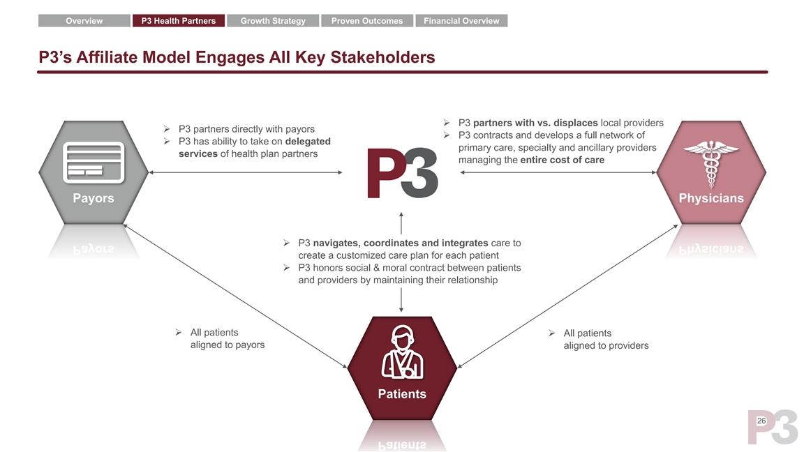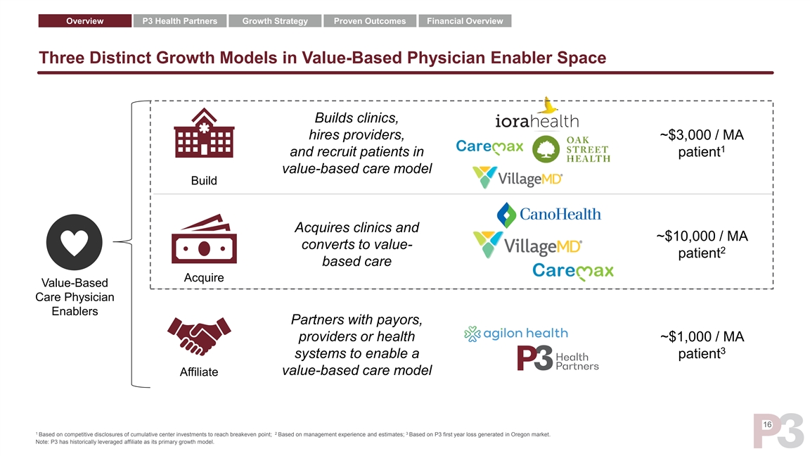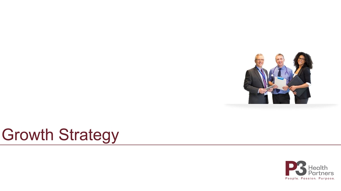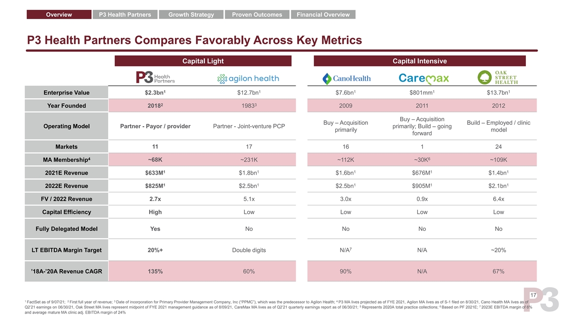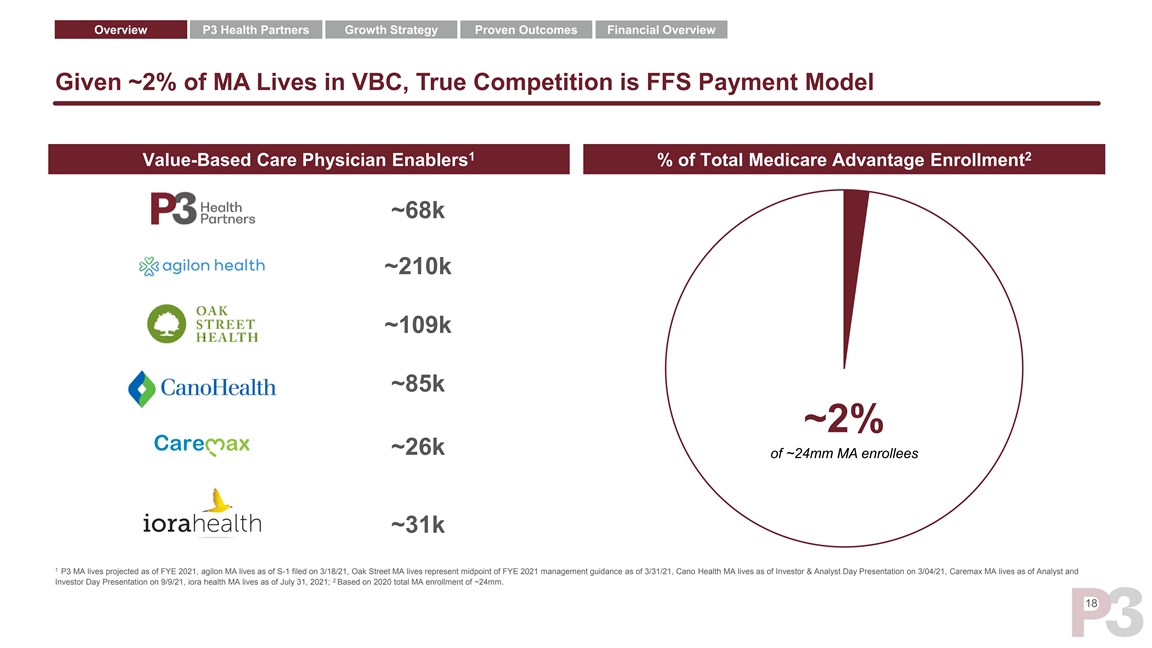 Overview P3 Health Partners Growth Strategy Proven Outcomes Financial Overview P3 Health Partners Compares Favorably Across Key Metrics Capital Light Capital Intensive 1 1 1 1 1 Enterprise Value $2.3bn $12.7bn $7.6bn $801mm $13.7bn 2 3 Year Founded 2018 1983 2009 2011 2012 Buy – Acquisition Buy – Acquisition Build – Employed / clinic Operating Model Partner - Payor / provider Partner - Joint-venture PCP primarily; Build – going primarily model forward Markets 11 17 16 1 24 4 6 MA Membership ~68K ~231K ~112K ~30K ~109K 1 1 1 1 1 2021E Revenue $633M $1.8bn $1.6bn $676M $1.4bn 1 1 1 1 1 2022E Revenue $825M $2.5bn $2.5bn $905M $2.1bn FV / 2022 Revenue 2.7x 5.1x 3.0x 0.9x 6.4x Capital Efficiency High Low Low Low Low Fully Delegated Model Yes No No No No 7 LT EBITDA Margin Target 20%+ Double digits N/A N/A ~20% ’18A-’20A Revenue CAGR 135% 60% 90% N/A 67% 17 1 2 3 4 FactSet as of 9/07/21; First full year of revenue; Date of incorporation for Primary Provider Management Company, Inc (“PPMC”), which was the predecessor to Agilon Health; P3 MA lives projected as of FYE 2021, Agilon MA lives as of S-1 filed on 8/30/21, Cano Health MA lives as of 5 6 7 Q2’21 earnings on 06/30/21, Oak Street MA lives represent midpoint of FYE 2021 management guidance as of 8/09/21, CareMax MA lives as of Q2’21 quarterly earnings report as of 06/30/21; Represents 2020A total practice collections; Based on PF 2021E; 2023E EBITDA margin of 6% and average mature MA clinic adj. EBITDA margin of 24%Overview P3 Health Partners Growth Strategy Proven Outcomes Financial Overview P3 Health Partners Compares Favorably Across Key Metrics Capital Light Capital Intensive 1 1 1 1 1 Enterprise Value $2.3bn $12.7bn $7.6bn $801mm $13.7bn 2 3 Year Founded 2018 1983 2009 2011 2012 Buy – Acquisition Buy – Acquisition Build – Employed / clinic Operating Model Partner - Payor / provider Partner - Joint-venture PCP primarily; Build – going primarily model forward Markets 11 17 16 1 24 4 6 MA Membership ~68K ~231K ~112K ~30K ~109K 1 1 1 1 1 2021E Revenue $633M $1.8bn $1.6bn $676M $1.4bn 1 1 1 1 1 2022E Revenue $825M $2.5bn $2.5bn $905M $2.1bn FV / 2022 Revenue 2.7x 5.1x 3.0x 0.9x 6.4x Capital Efficiency High Low Low Low Low Fully Delegated Model Yes No No No No 7 LT EBITDA Margin Target 20%+ Double digits N/A N/A ~20% ’18A-’20A Revenue CAGR 135% 60% 90% N/A 67% 17 1 2 3 4 FactSet as of 9/07/21; First full year of revenue; Date of incorporation for Primary Provider Management Company, Inc (“PPMC”), which was the predecessor to Agilon Health; P3 MA lives projected as of FYE 2021, Agilon MA lives as of S-1 filed on 8/30/21, Cano Health MA lives as of 5 6 7 Q2’21 earnings on 06/30/21, Oak Street MA lives represent midpoint of FYE 2021 management guidance as of 8/09/21, CareMax MA lives as of Q2’21 quarterly earnings report as of 06/30/21; Represents 2020A total practice collections; Based on PF 2021E; 2023E EBITDA margin of 6% and average mature MA clinic adj. EBITDA margin of 24%