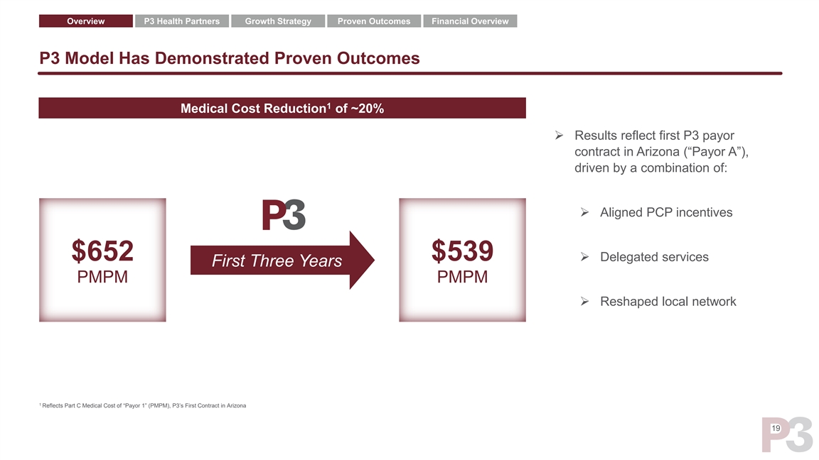 Overview P3 Health Partners Growth Strategy Proven Outcomes Financial Overview Given ~2% of MA Lives in VBC, True Competition is FFS Payment Model 1 2 Value-Based Care Physician Enablers % of Total Medicare Advantage Enrollment ~68k ~210k ~109k ~85k ~2% ~26k of ~24mm MA enrollees ~31k 1 P3 MA lives projected as of FYE 2021, agilon MA lives as of S-1 filed on 3/18/21, Oak Street MA lives represent midpoint of FYE 2021 management guidance as of 3/31/21, Cano Health MA lives as of Investor & Analyst Day Presentation on 3/04/21, Caremax MA lives as of Analyst and 2 Investor Day Presentation on 9/9/21, iora health MA lives as of July 31, 2021; Based on 2020 total MA enrollment of ~24mm. 18Overview P3 Health Partners Growth Strategy Proven Outcomes Financial Overview Given ~2% of MA Lives in VBC, True Competition is FFS Payment Model 1 2 Value-Based Care Physician Enablers % of Total Medicare Advantage Enrollment ~68k ~210k ~109k ~85k ~2% ~26k of ~24mm MA enrollees ~31k 1 P3 MA lives projected as of FYE 2021, agilon MA lives as of S-1 filed on 3/18/21, Oak Street MA lives represent midpoint of FYE 2021 management guidance as of 3/31/21, Cano Health MA lives as of Investor & Analyst Day Presentation on 3/04/21, Caremax MA lives as of Analyst and 2 Investor Day Presentation on 9/9/21, iora health MA lives as of July 31, 2021; Based on 2020 total MA enrollment of ~24mm. 18