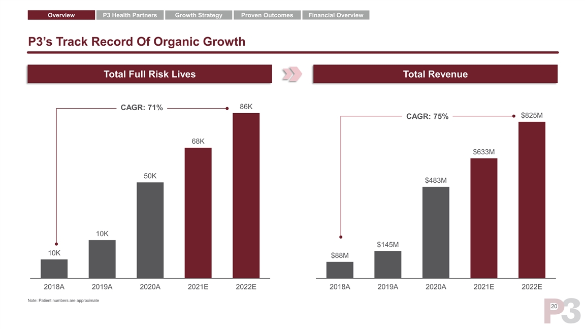 Overview P3 Health Partners Growth Strategy Proven Outcomes Financial Overview P3 Model Has Demonstrated Proven Outcomes 1 Medical Cost Reduction of ~20% ➢ Results reflect first P3 payor contract in Arizona (“Payor A”), driven by a combination of: ➢ Aligned PCP incentives $652 $539 ➢ Delegated services First Three Years PMPM PMPM ➢ Reshaped local network 1 Reflects Part C Medical Cost of “Payor 1” (PMPM), P3’s First Contract in Arizona 19Overview P3 Health Partners Growth Strategy Proven Outcomes Financial Overview P3 Model Has Demonstrated Proven Outcomes 1 Medical Cost Reduction of ~20% ➢ Results reflect first P3 payor contract in Arizona (“Payor A”), driven by a combination of: ➢ Aligned PCP incentives $652 $539 ➢ Delegated services First Three Years PMPM PMPM ➢ Reshaped local network 1 Reflects Part C Medical Cost of “Payor 1” (PMPM), P3’s First Contract in Arizona 19