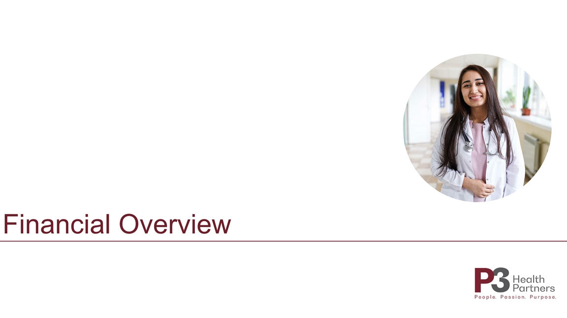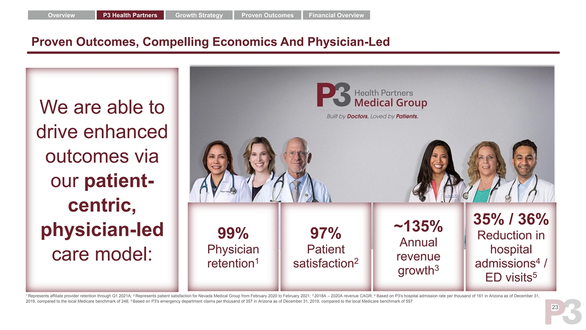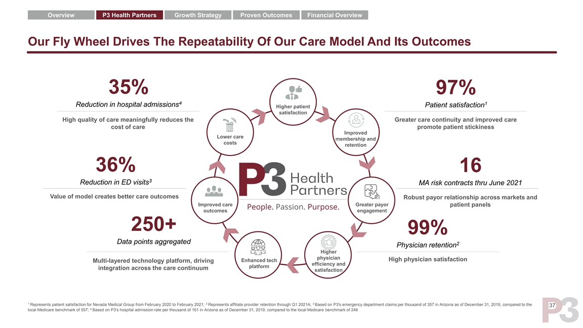 Overview P3 Health Partners Growth Strategy Proven Outcomes Financial Overview Our Fly Wheel Drives The Repeatability Of Our Care Model And Its Outcomes 35% 97% 4 1 Reduction in hospital admissions Patient satisfaction Higher patient satisfaction High quality of care meaningfully reduces the Greater care continuity and improved care cost of care promote patient stickiness Improved Lower care membership and costs retention 36% 16 3 Reduction in ED visits MA risk contracts thru June 2021 Value of model creates better care outcomes Robust payor relationship across markets and Improved care Greater payor patient panels outcomes engagement 250+ 99% Data points aggregated 2 Physician retention Higher physician High physician satisfaction Enhanced tech Multi-layered technology platform, driving efficiency and platform integration across the care continuum satisfaction 1 2 3 Represents patient satisfaction for Nevada Medical Group from February 2020 to February 2021; Represents affiliate provider retention through Q1 2021A; Based on P3's emergency department claims per thousand of 357 in Arizona as of December 31, 2019, compared to the 37 4 local Medicare benchmark of 557; Based on P3's hospital admission rate per thousand of 161 in Arizona as of December 31, 2019, compared to the local Medicare benchmark of 248Overview P3 Health Partners Growth Strategy Proven Outcomes Financial Overview Our Fly Wheel Drives The Repeatability Of Our Care Model And Its Outcomes 35% 97% 4 1 Reduction in hospital admissions Patient satisfaction Higher patient satisfaction High quality of care meaningfully reduces the Greater care continuity and improved care cost of care promote patient stickiness Improved Lower care membership and costs retention 36% 16 3 Reduction in ED visits MA risk contracts thru June 2021 Value of model creates better care outcomes Robust payor relationship across markets and Improved care Greater payor patient panels outcomes engagement 250+ 99% Data points aggregated 2 Physician retention Higher physician High physician satisfaction Enhanced tech Multi-layered technology platform, driving efficiency and platform integration across the care continuum satisfaction 1 2 3 Represents patient satisfaction for Nevada Medical Group from February 2020 to February 2021; Represents affiliate provider retention through Q1 2021A; Based on P3's emergency department claims per thousand of 357 in Arizona as of December 31, 2019, compared to the 37 4 local Medicare benchmark of 557; Based on P3's hospital admission rate per thousand of 161 in Arizona as of December 31, 2019, compared to the local Medicare benchmark of 248