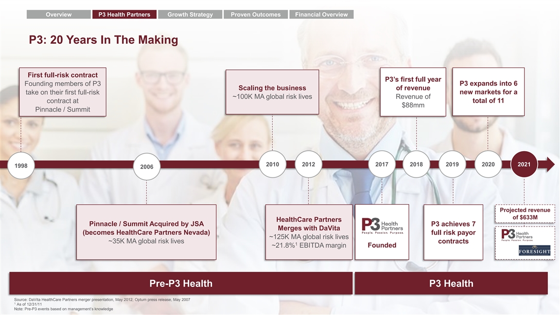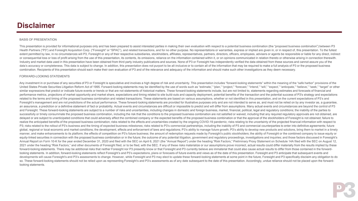 Disclaimer BASIS OF PRESENTATION This presentation is provided for informational purposes only and has been prepared to assist interested parties in making their own evaluation with respect to a potential business combination (the “proposed business combination”) between P3 Health Partners (“P3”) and Foresight Acquisition Corp. (“Foresight” or “SPAC”), and related transactions, and for no other purpose. No representations or warranties, express or implied are given in, or in respect of, this presentation. To the fullest extent permitted by law, in no circumstances will P3, Foresight or any of their respective subsidiaries, stockholders, affiliates, representatives, partners, directors, officers, employees, advisers or agents be responsible or liable for any direct, indirect or consequential loss or loss of profit arising from the use of this presentation, its contents, its omissions, reliance on the information contained within it, or on opinions communicated in relation thereto or otherwise arising in connection therewith. Industry and market data used in this presentation have been obtained from third party industry publications and sources. None of P3 or Foresight has independently verified the data obtained from these sources and cannot assure you of the data’s accuracy or completeness. This data is subject to change. In addition, this presentation does not purport to be all-inclusive or to contain all of the information that may be required to make a full analysis of P3 or the proposed business combination. Recipients of this presentation should each make their own evaluation of P3 and of the relevance and adequacy of the information and should make such other investigations as they deem necessary. FORWARD-LOOKING STATEMENTS Any investment in or purchase of any securities of P3 or Foresight is speculative and involves a high degree of risk and uncertainty. This presentation includes “forward-looking statements” within the meaning of the “safe harbor” provisions of the United States Private Securities Litigation Reform Act of 1995. Forward-looking statements may be identified by the use of words such as “estimate,” “plan,” “project,” “forecast,” “intend,” “will,” “expect,” “anticipate,” “believe,” “seek,” “target” or other similar expressions that predict or indicate future events or trends or that are not statements of historical matters. These forward-looking statements include, but are not limited to, statements regarding estimates and forecasts of financial and performance metrics, projections of market opportunity and market share, expectations and timing related to site build-outs and capacity deployment, potential benefits of the transaction and the potential success of P3's strategy and expectations related to the terms and timing of the proposed business combination and related transactions. These statements are based on various assumptions, whether or not identified in this presentation, and on the current expectations of P3’s and Foresight’s management and are not predictions of the actual performance. These forward-looking statements are provided for illustrative purposes only and are not intended to serve as, and must not be relied on by any investor as, a guarantee, an assurance, a prediction or a definitive statement of fact or probability. Actual events and circumstances are difficult or impossible to predict and will differ from assumptions. Many actual events and circumstances are beyond the control of P3 and Foresight. These forward-looking statements are subject to a number of risks and uncertainties, including changes in domestic and foreign business, market, financial, political, legal and regulatory conditions; the inability of the parties to successfully or timely consummate the proposed business combination, including the risk that the conditions to the proposed business combination are not satisfied or waived, including that any required regulatory approvals are not obtained, are delayed or are subject to unanticipated conditions that could adversely affect the combined company or the expected benefits of the proposed business combination or that the approval of the stockholders of Foresight is not obtained; failure to realize the anticipated benefits of the proposed business combination; risks related to the effects and uncertainties created by the ongoing COVID-19 pandemic; risks relating to the uncertainty of the projected financial information with respect to P3; risks related to the rollout of P3’s business and the timing of expected business milestones; risks related to P3’s commercial partnerships, including the inability of P3 and commercial counterparties to enter into definitive agreements; future global, regional or local economic and market conditions; the development, effects and enforcement of laws and regulations; P3’s ability to manage future growth; P3’s ability to develop new products and solutions, bring them to market in a timely manner, and make enhancements to its platform; the effects of competition on P3’s future business; the amount of redemption requests made by Foresight’s public stockholders; the ability of Foresight or the combined company to issue equity or equity-linked securities in connection with the proposed business combination or in the future; the outcome of any potential litigation, government and regulatory proceedings, investigations and inquiries; and those factors discussed in Foresight’s Annual Report on Form 10-K for the year ended December 31, 2020 and filed with the SEC on April 6, 2021 (the “Annual Report”) under the heading “Risk Factors,” Preliminary Proxy Statement on Schedule 14A filed with the SEC on August 12, 2021 under the heading “Risk Factors,” and other documents of Foresight filed, or to be filed, with the SEC. If any of these risks materialize or our assumptions prove incorrect, actual results could 