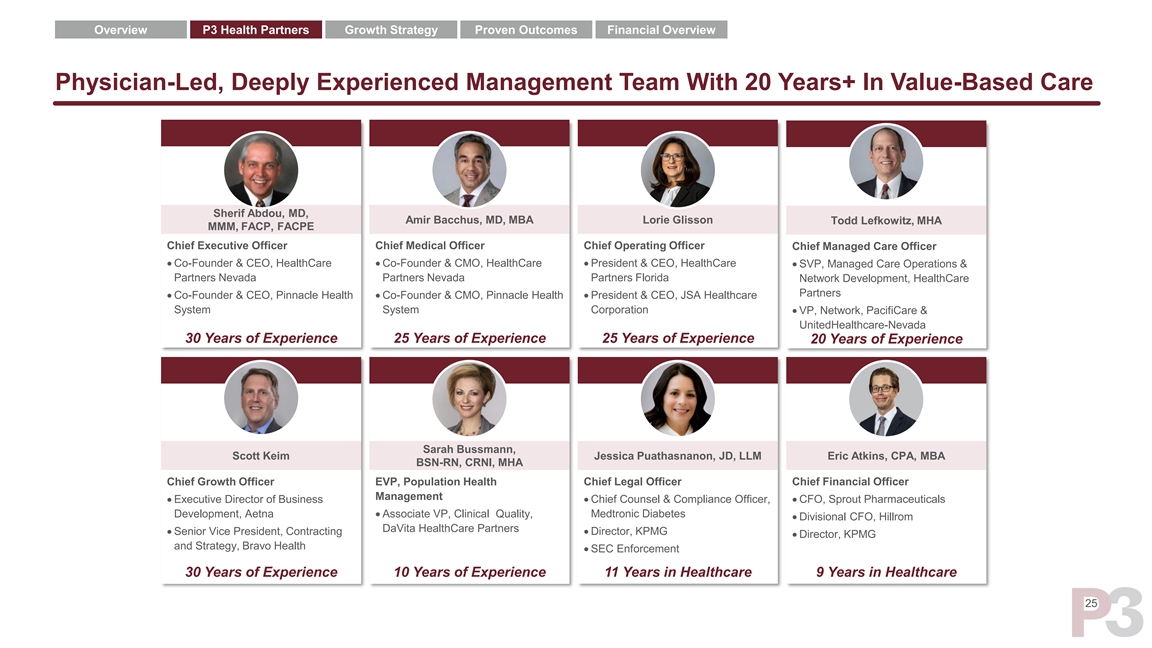 Overview P3 Health Partners Growth Strategy Proven Outcomes Financial Overview P3: 20 Years In The Making First full-risk contract P3’s first full year P3 expands into 6 Founding members of P3 Scaling the business of revenue new markets for a take on their first full-risk ~100K MA global risk lives Revenue of contract at total of 11 $88mm Pinnacle / Summit 2010 2012 2017 2018 2019 2020 2021 1998 2006 Projected revenue of $633M HealthCare Partners Pinnacle / Summit Acquired by JSA P3 achieves 7 Merges with DaVita (becomes HealthCare Partners Nevada) full risk payor ~125K MA global risk lives ~35K MA global risk lives contracts 1 ~21.8% EBITDA margin Founded Pre-P3 Health P3 Health 24 Source: DaVita HealthCare Partners merger presentation, May 2012; Optum press release, May 2007 1 As of 12/31/11 Note: Pre-P3 events based on management’s knowledgeOverview P3 Health Partners Growth Strategy Proven Outcomes Financial Overview P3: 20 Years In The Making First full-risk contract P3’s first full year P3 expands into 6 Founding members of P3 Scaling the business of revenue new markets for a take on their first full-risk ~100K MA global risk lives Revenue of contract at total of 11 $88mm Pinnacle / Summit 2010 2012 2017 2018 2019 2020 2021 1998 2006 Projected revenue of $633M HealthCare Partners Pinnacle / Summit Acquired by JSA P3 achieves 7 Merges with DaVita (becomes HealthCare Partners Nevada) full risk payor ~125K MA global risk lives ~35K MA global risk lives contracts 1 ~21.8% EBITDA margin Founded Pre-P3 Health P3 Health 24 Source: DaVita HealthCare Partners merger presentation, May 2012; Optum press release, May 2007 1 As of 12/31/11 Note: Pre-P3 events based on management’s knowledge