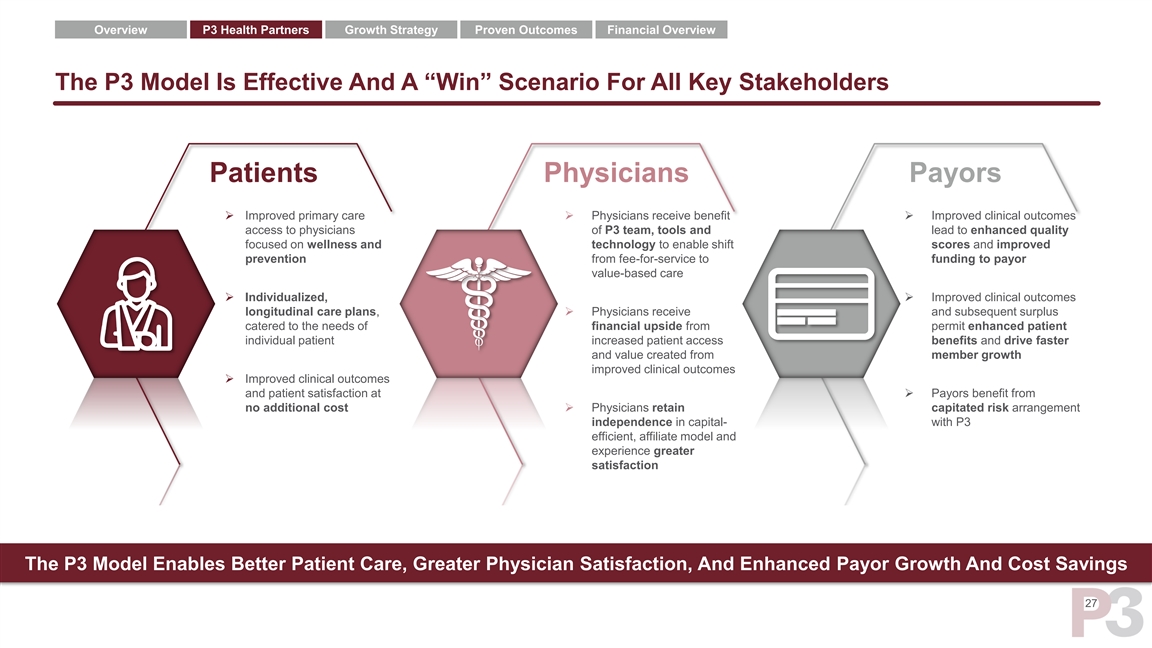 Overview P3 Health Partners Growth Strategy Proven Outcomes Financial Overview P3’s Affiliate Model Engages All Key Stakeholders ➢ P3 partners with vs. displaces local providers ➢ P3 partners directly with payors ➢ P3 contracts and develops a full network of ➢ P3 has ability to take on delegated primary care, specialty and ancillary providers services of health plan partners managing the entire cost of care Payors Physicians ➢ P3 navigates, coordinates and integrates care to create a customized care plan for each patient ➢ P3 honors social & moral contract between patients and providers by maintaining their relationship ➢ All patients ➢ All patients aligned to payors aligned to providers Patients 26Overview P3 Health Partners Growth Strategy Proven Outcomes Financial Overview P3’s Affiliate Model Engages All Key Stakeholders ➢ P3 partners with vs. displaces local providers ➢ P3 partners directly with payors ➢ P3 contracts and develops a full network of ➢ P3 has ability to take on delegated primary care, specialty and ancillary providers services of health plan partners managing the entire cost of care Payors Physicians ➢ P3 navigates, coordinates and integrates care to create a customized care plan for each patient ➢ P3 honors social & moral contract between patients and providers by maintaining their relationship ➢ All patients ➢ All patients aligned to payors aligned to providers Patients 26
