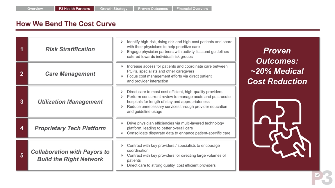 Overview P3 Health Partners Growth Strategy Proven Outcomes Financial Overview The P3 Model Is Effective And A “Win” Scenario For All Key Stakeholders Patients Physicians Payors ➢ Improved primary care ➢ Physicians receive benefit ➢ Improved clinical outcomes access to physicians of P3 team, tools and lead to enhanced quality focused on wellness and technology to enable shift scores and improved prevention from fee-for-service to funding to payor value-based care ➢ Individualized, ➢ Improved clinical outcomes longitudinal care plans, ➢ Physicians receive and subsequent surplus catered to the needs of financial upside from permit enhanced patient individual patient increased patient access benefits and drive faster and value created from member growth improved clinical outcomes ➢ Improved clinical outcomes and patient satisfaction at ➢ Payors benefit from no additional cost➢ Physicians retain capitated risk arrangement independence in capital- with P3 efficient, affiliate model and experience greater satisfaction The P3 Model Enables Better Patient Care, Greater Physician Satisfaction, And Enhanced Payor Growth And Cost Savings 27Overview P3 Health Partners Growth Strategy Proven Outcomes Financial Overview The P3 Model Is Effective And A “Win” Scenario For All Key Stakeholders Patients Physicians Payors ➢ Improved primary care ➢ Physicians receive benefit ➢ Improved clinical outcomes access to physicians of P3 team, tools and lead to enhanced quality focused on wellness and technology to enable shift scores and improved prevention from fee-for-service to funding to payor value-based care ➢ Individualized, ➢ Improved clinical outcomes longitudinal care plans, ➢ Physicians receive and subsequent surplus catered to the needs of financial upside from permit enhanced patient individual patient increased patient access benefits and drive faster and value created from member growth improved clinical outcomes ➢ Improved clinical outcomes and patient satisfaction at ➢ Payors benefit from no additional cost➢ Physicians retain capitated risk arrangement independence in capital- with P3 efficient, affiliate model and experience greater satisfaction The P3 Model Enables Better Patient Care, Greater Physician Satisfaction, And Enhanced Payor Growth And Cost Savings 27