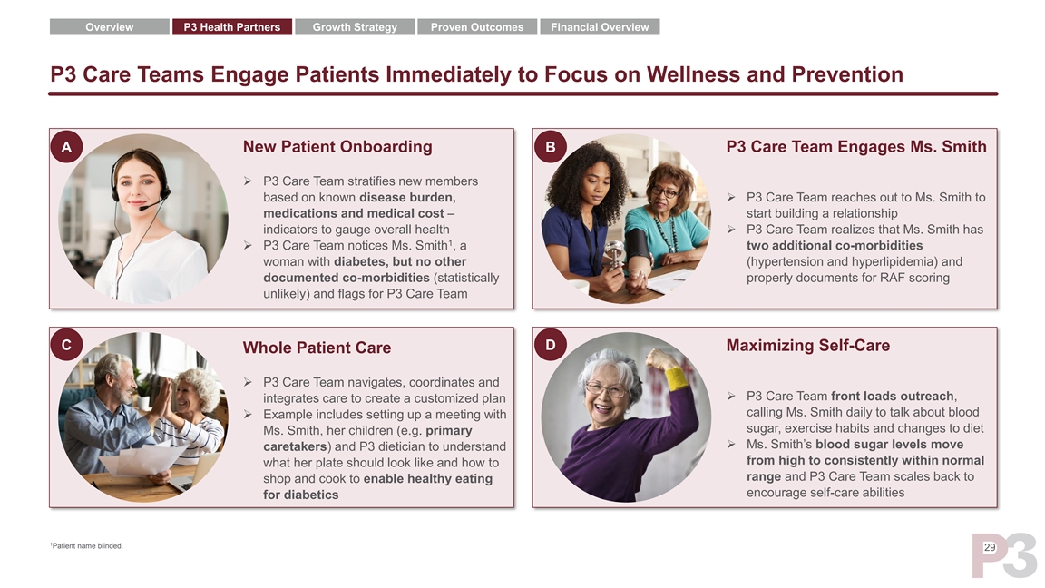 Overview P3 Health Partners Growth Strategy Proven Outcomes Financial Overview P3 Care Teams Engage Patients Immediately to Focus on Wellness and Prevention A New Patient Onboarding B P3 Care Team Engages Ms. Smith ➢ P3 Care Team stratifies new members based on known disease burden, ➢ P3 Care Team reaches out to Ms. Smith to medications and medical cost – start building a relationship indicators to gauge overall health➢ P3 Care Team realizes that Ms. Smith has 1 ➢ P3 Care Team notices Ms. Smith , a two additional co-morbidities woman with diabetes, but no other (hypertension and hyperlipidemia) and documented co-morbidities (statistically properly documents for RAF scoring unlikely) and flags for P3 Care Team C D Maximizing Self-Care Whole Patient Care ➢ P3 Care Team navigates, coordinates and ➢ P3 Care Team front loads outreach, integrates care to create a customized plan calling Ms. Smith daily to talk about blood ➢ Example includes setting up a meeting with sugar, exercise habits and changes to diet Ms. Smith, her children (e.g. primary ➢ Ms. Smith’s blood sugar levels move caretakers) and P3 dietician to understand from high to consistently within normal what her plate should look like and how to range and P3 Care Team scales back to shop and cook to enable healthy eating encourage self-care abilities for diabetics 1 Patient name blinded. 29Overview P3 Health Partners Growth Strategy Proven Outcomes Financial Overview P3 Care Teams Engage Patients Immediately to Focus on Wellness and Prevention A New Patient Onboarding B P3 Care Team Engages Ms. Smith ➢ P3 Care Team stratifies new members based on known disease burden, ➢ P3 Care Team reaches out to Ms. Smith to medications and medical cost – start building a relationship indicators to gauge overall health➢ P3 Care Team realizes that Ms. Smith has 1 ➢ P3 Care Team notices Ms. Smith , a two additional co-morbidities woman with diabetes, but no other (hypertension and hyperlipidemia) and documented co-morbidities (statistically properly documents for RAF scoring unlikely) and flags for P3 Care Team C D Maximizing Self-Care Whole Patient Care ➢ P3 Care Team navigates, coordinates and ➢ P3 Care Team front loads outreach, integrates care to create a customized plan calling Ms. Smith daily to talk about blood ➢ Example includes setting up a meeting with sugar, exercise habits and changes to diet Ms. Smith, her children (e.g. primary ➢ Ms. Smith’s blood sugar levels move caretakers) and P3 dietician to understand from high to consistently within normal what her plate should look like and how to range and P3 Care Team scales back to shop and cook to enable healthy eating encourage self-care abilities for diabetics 1 Patient name blinded. 29