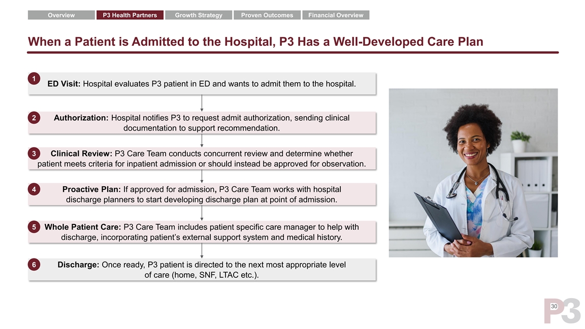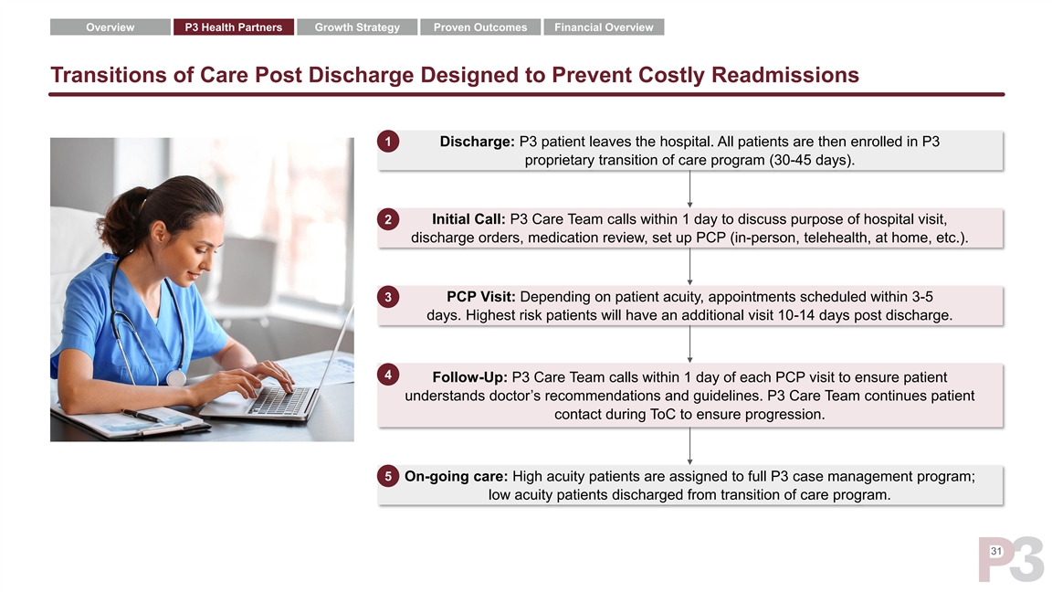 Overview P3 Health Partners Growth Strategy Proven Outcomes Financial Overview When a Patient is Admitted to the Hospital, P3 Has a Well-Developed Care Plan 1 ED Visit: Hospital evaluates P3 patient in ED and wants to admit them to the hospital. 2 Authorization: Hospital notifies P3 to request admit authorization, sending clinical documentation to support recommendation. 3 Clinical Review: P3 Care Team conducts concurrent review and determine whether patient meets criteria for inpatient admission or should instead be approved for observation. 4 Proactive Plan: If approved for admission, P3 Care Team works with hospital discharge planners to start developing discharge plan at point of admission. 5 Whole Patient Care: P3 Care Team includes patient specific care manager to help with discharge, incorporating patient’s external support system and medical history. 6 Discharge: Once ready, P3 patient is directed to the next most appropriate level of care (home, SNF, LTAC etc.). 30