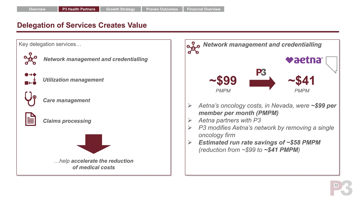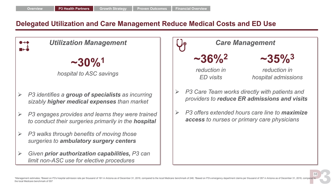 Overview P3 Health Partners Growth Strategy Proven Outcomes Financial Overview Delegation of Services Creates Value Key delegation services… Network management and credentialling Network management and credentialling Utilization management ~$99 ~$41 PMPM PMPM Care management ➢ Aetna’s oncology costs, in Nevada, were ~$99 per member per month (PMPM) ➢ Aetna partners with P3 Claims processing ➢ P3 modifies Aetna’s network by removing a single oncology firm ➢ Estimated run rate savings of ~$58 PMPM (reduction from ~$99 to ~$41 PMPM) …help accelerate the reduction of medical costs 32Overview P3 Health Partners Growth Strategy Proven Outcomes Financial Overview Delegation of Services Creates Value Key delegation services… Network management and credentialling Network management and credentialling Utilization management ~$99 ~$41 PMPM PMPM Care management ➢ Aetna’s oncology costs, in Nevada, were ~$99 per member per month (PMPM) ➢ Aetna partners with P3 Claims processing ➢ P3 modifies Aetna’s network by removing a single oncology firm ➢ Estimated run rate savings of ~$58 PMPM (reduction from ~$99 to ~$41 PMPM) …help accelerate the reduction of medical costs 32