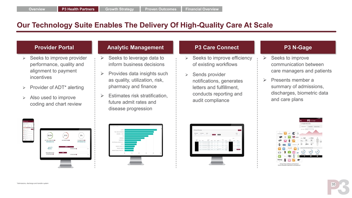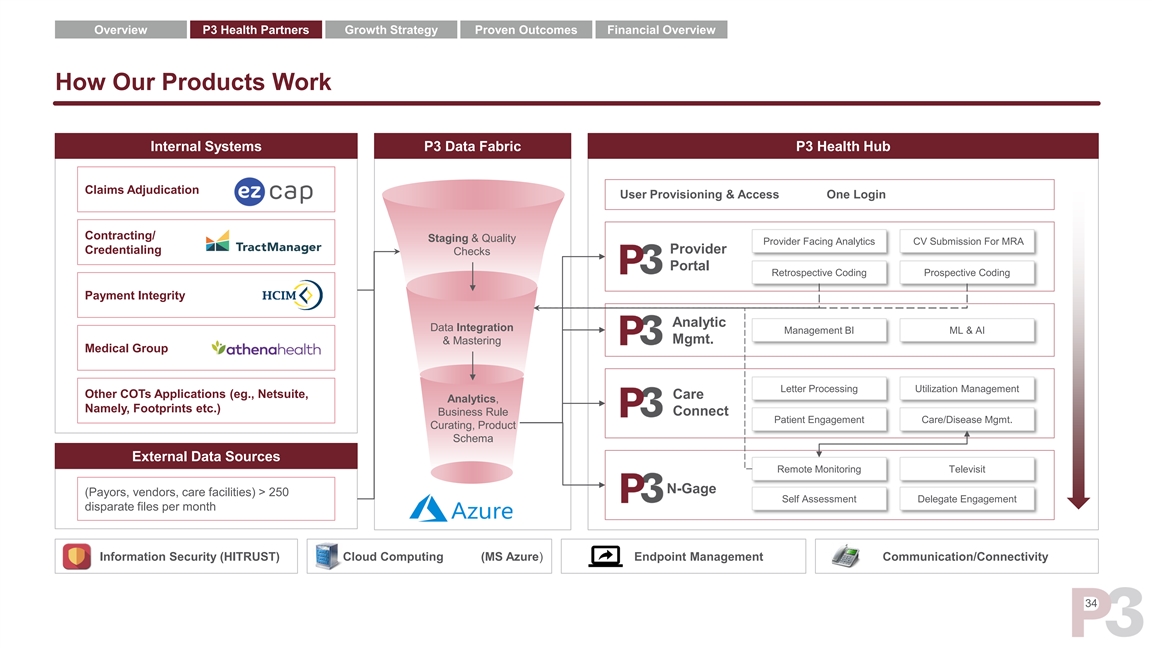 Overview P3 Health Partners Growth Strategy Proven Outcomes Financial Overview How Our Products Work Internal Systems P3 Data Fabric P3 Health Hub Claims Adjudication User Provisioning & Access One Login Contracting/ Staging & Quality Provider Facing Analytics CV Submission For MRA Credentialing Provider Checks Portal Retrospective Coding Prospective Coding Payment Integrity Analytic Data Integration Management BI ML & AI & Mastering Mgmt. Medical Group Letter Processing Utilization Management Other COTs Applications (eg., Netsuite, Care Analytics, Namely, Footprints etc.) Business Rule Connect Patient Engagement Care/Disease Mgmt. Curating, Product Schema External Data Sources Remote Monitoring Televisit N-Gage (Payors, vendors, care facilities) > 250 Self Assessment Delegate Engagement disparate files per month Information Security (HITRUST) Cloud Computing (MS Azure) Endpoint Management Communication/Connectivity 34Overview P3 Health Partners Growth Strategy Proven Outcomes Financial Overview How Our Products Work Internal Systems P3 Data Fabric P3 Health Hub Claims Adjudication User Provisioning & Access One Login Contracting/ Staging & Quality Provider Facing Analytics CV Submission For MRA Credentialing Provider Checks Portal Retrospective Coding Prospective Coding Payment Integrity Analytic Data Integration Management BI ML & AI & Mastering Mgmt. Medical Group Letter Processing Utilization Management Other COTs Applications (eg., Netsuite, Care Analytics, Namely, Footprints etc.) Business Rule Connect Patient Engagement Care/Disease Mgmt. Curating, Product Schema External Data Sources Remote Monitoring Televisit N-Gage (Payors, vendors, care facilities) > 250 Self Assessment Delegate Engagement disparate files per month Information Security (HITRUST) Cloud Computing (MS Azure) Endpoint Management Communication/Connectivity 34