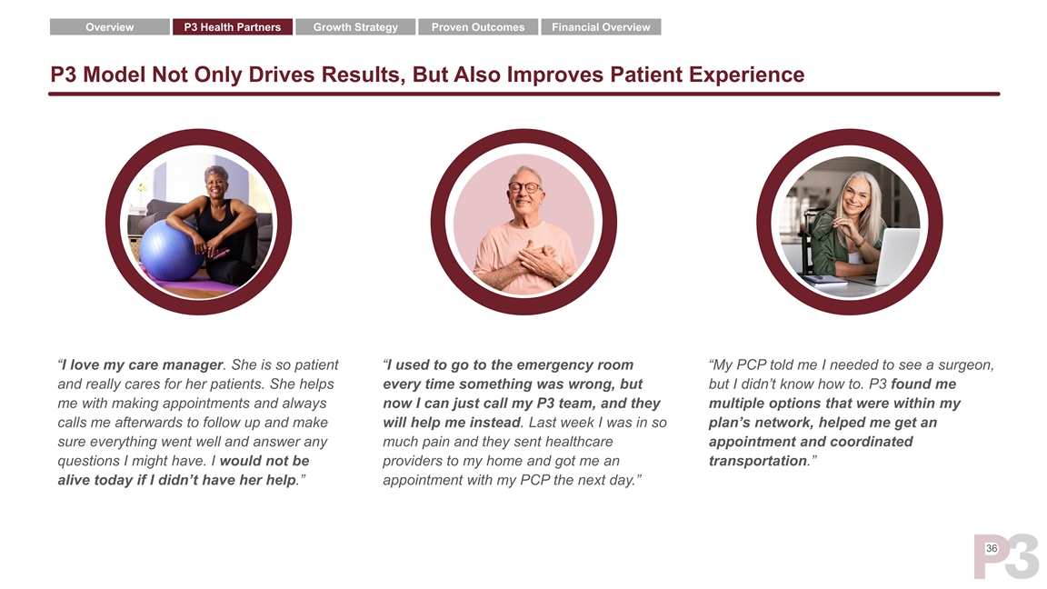 Overview P3 Health Partners Growth Strategy Proven Outcomes Financial Overview P3 Model Not Only Drives Results, But Also Improves Patient Experience “I love my care manager. She is so patient “I used to go to the emergency room “My PCP told me I needed to see a surgeon, and really cares for her patients. She helps every time something was wrong, but but I didn’t know how to. P3 found me me with making appointments and always now I can just call my P3 team, and they multiple options that were within my calls me afterwards to follow up and make will help me instead. Last week I was in so plan’s network, helped me get an sure everything went well and answer any much pain and they sent healthcare appointment and coordinated questions I might have. I would not be providers to my home and got me an transportation.” alive today if I didn’t have her help.” appointment with my PCP the next day.” 36Overview P3 Health Partners Growth Strategy Proven Outcomes Financial Overview P3 Model Not Only Drives Results, But Also Improves Patient Experience “I love my care manager. She is so patient “I used to go to the emergency room “My PCP told me I needed to see a surgeon, and really cares for her patients. She helps every time something was wrong, but but I didn’t know how to. P3 found me me with making appointments and always now I can just call my P3 team, and they multiple options that were within my calls me afterwards to follow up and make will help me instead. Last week I was in so plan’s network, helped me get an sure everything went well and answer any much pain and they sent healthcare appointment and coordinated questions I might have. I would not be providers to my home and got me an transportation.” alive today if I didn’t have her help.” appointment with my PCP the next day.” 36