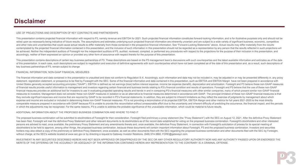 Disclaimer USE OF PROJECTIONS AND DESCRIPTION OF KEY CONTRACTS AND PARTNERSHIPS This presentation contains projected financial information with respect to P3, namely revenue and EBITDA for 2021. Such projected financial information constitutes forward-looking information, and is for illustrative purposes only and should not be relied upon as necessarily being indicative of future results. The assumptions and estimates underlying such projected financial information are inherently uncertain and are subject to a wide variety of significant business, economic, competitive and other risks and uncertainties that could cause actual results to differ materially from those contained in the prospective financial information. See “Forward-Looking Statements” above. Actual results may differ materially from the results contemplated by the projected financial information contained in this presentation, and the inclusion of such information in this presentation should not be regarded as a representation by any person that the results reflected in such projections will be achieved. Neither the independent auditors of Foresight nor the independent auditors of P3, audited, reviewed, compiled, or performed any procedures with respect to the projections for the purpose of their inclusion in this presentation, and accordingly, neither of them expressed an opinion or provided any other form of assurance with respect thereto for the purpose of this presentation. This presentation contains descriptions of certain key business partnerships of P3. These descriptions are based on the P3 management team’s discussions with such counterparties and the latest available information and estimates as of the date of this presentation. In each case, such descriptions are subject to negotiation and execution of definitive agreements with such counterparties which have not been completed as of the date of this presentation and, as a result, such descriptions of key business partnerships of P3, remain subject to change FINANCIAL INFORMATION; NON-GAAP FINANCIAL MEASURES The financial information and data contained in this presentation is unaudited and does not conform to Regulation S-X. Accordingly, such information and data may not be included in, may be adjusted in or may be presented differently in, any proxy statement, registration statement, or prospectus to be filed by Foresight with the SEC. Some of the financial information and data contained in this presentation, such as EBITDA and EBITDA Margin have not been prepared in accordance with United States generally accepted accounting principles (“GAAP”). EBITDA is defined as net earnings (loss) before interest expense, income tax expense (benefit), depreciation and amortization. Foresight and P3 believe these non-GAAP measures of financial results provide useful information to management and investors regarding certain financial and business trends relating to P3’s financial condition and results of operations. Foresight and P3 believe that the use of these non-GAAP financial measures provides an additional tool for investors to use in evaluating projected operating results and trends in and in comparing P3’s financial measures with other similar companies, many of which present similar non-GAAP financial measures to investors. Management does not consider these non-GAAP measures in isolation or as an alternative to financial measures determined in accordance with GAAP. The principal limitation of these non-GAAP financial measures is that they exclude significant expenses and income that are required by GAAP to be recorded in P3’s financial statements. In addition, they are subject to inherent limitations as they reflect the exercise of judgments by management about which expense and income are excluded or included in determining these non-GAAP financial measures. P3 is not providing a reconciliation of its projected EBITDA, EBITDA Margin and other metrics for full years 2021-2025 to the most directly comparable measure prepared in accordance with GAAP because P3 is unable to provide this reconciliation without unreasonable effort due to the uncertainty and inherent difficulty of predicting the occurrence, the financial impact, and the periods in which the adjustments may be recognized. For the same reasons, P3 is unable to address the probable significance of the unavailable information, which could be material to future results. ADDITIONAL INFORMATION ABOUT THE PROPOSED BUSINESS COMBINATION AND WHERE TO FIND IT The proposed business combination will be submitted to stockholders of Foresight for their consideration. Foresight filed preliminary a proxy statement (the “Proxy Statement”) with the SEC on August 12, 2021. After the definitive Proxy Statement has been filed, Foresight will mail the definitive Proxy Statement and other relevant documents to its stockholders as of the record date established for voting on the proposed business combination. Foresight's stockholders and other interested persons are advised to read, once available, the preliminary Proxy Statement and any amendments thereto and, once available, the definitive Proxy Statement, in connection with Foresight's solicitation of proxies for its special meeting of stockholders to be held to approve, among other things, the proposed business combination, because these documents will contain important information about Foresight, P3 and the proposed business combination. Investors and securities holders may also obtain a copy of the preliminary or definitive Proxy Statement, once available, as well as other documents filed with the SEC regarding the proposed business combination and other documents filed with the SEC by Foresight, without charge, at the SEC's website located at www.sec.gov or by directing a request to Gateway Investor Relations, (949) 574-3860, FORE@gatewayir.com. INVESTMENT IN ANY SECURITIES DESCRIBED HEREIN HAS NOT BEEN APPROVED OR DISAPPROVED BY THE SEC OR ANY OTHER R
