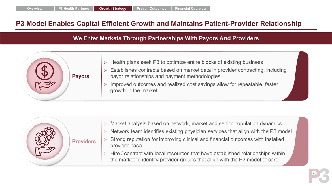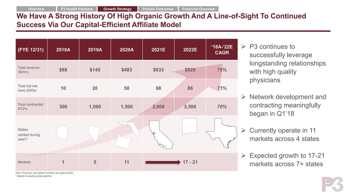 Overview P3 Health Partners Growth Strategy Proven Outcomes Financial Overview We Have A Strong History Of High Organic Growth And A Line-of-Sight To Continued Success Via Our Capital-Efficient Affiliate Model ’18A-’22E ➢ P3 continues to (FYE 12/31) 2018A 2019A 2020A 2021E 2022E CAGR successfully leverage longstanding relationships Total revenue $88 $145 $483 $633 $825 75% ($mm) with high quality physicians Total full risk 10 20 50 68 86 71% lives (000s) ➢ Network development and Total contracted contracting meaningfully 300 1,000 1,500 2,000 2,500 70% PCPs began in Q1’18 States ➢ Currently operate in 11 (added during 1 year) markets across 4 states ➢ Expected growth to 17-21 Markets 1 5 11 17 - 21 markets across 7+ states Note: Physician and patient numbers are approximate 1 Based on existing sales pipeline 39Overview P3 Health Partners Growth Strategy Proven Outcomes Financial Overview We Have A Strong History Of High Organic Growth And A Line-of-Sight To Continued Success Via Our Capital-Efficient Affiliate Model ’18A-’22E ➢ P3 continues to (FYE 12/31) 2018A 2019A 2020A 2021E 2022E CAGR successfully leverage longstanding relationships Total revenue $88 $145 $483 $633 $825 75% ($mm) with high quality physicians Total full risk 10 20 50 68 86 71% lives (000s) ➢ Network development and Total contracted contracting meaningfully 300 1,000 1,500 2,000 2,500 70% PCPs began in Q1’18 States ➢ Currently operate in 11 (added during 1 year) markets across 4 states ➢ Expected growth to 17-21 Markets 1 5 11 17 - 21 markets across 7+ states Note: Physician and patient numbers are approximate 1 Based on existing sales pipeline 39