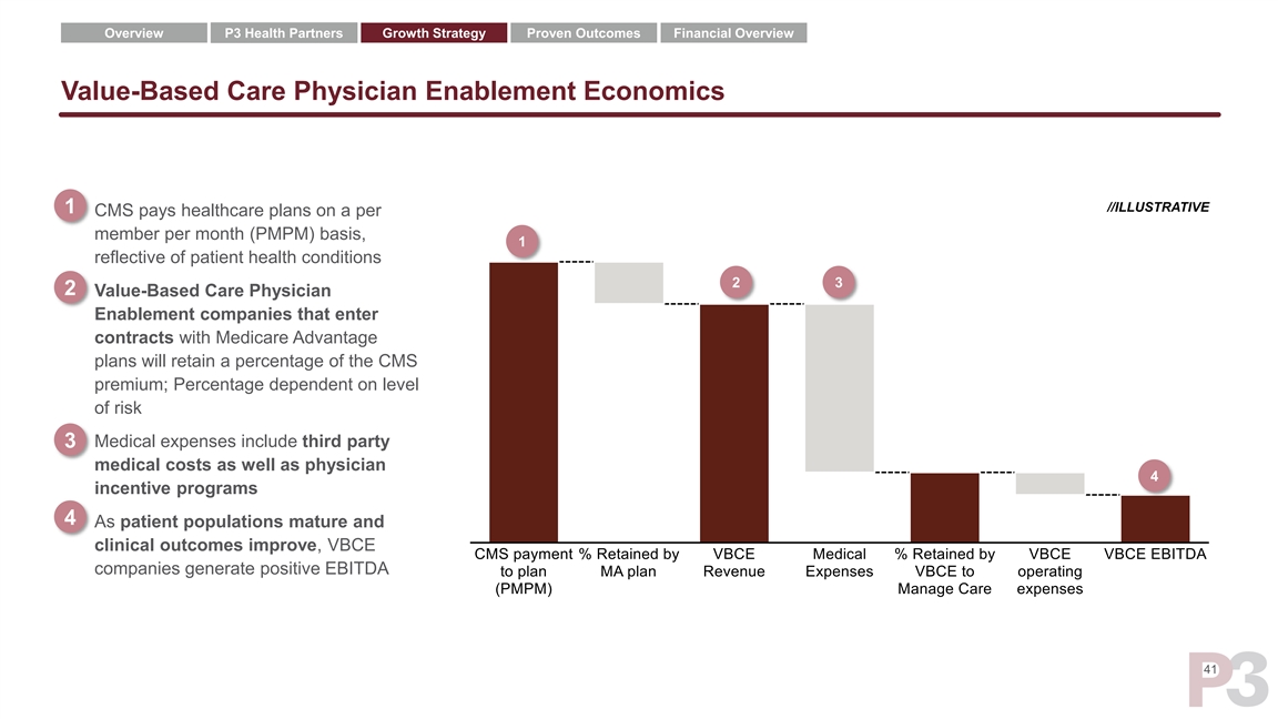 Overview P3 Health Partners Growth Strategy Proven Outcomes Financial Overview Value-Based Care Physician Enablement Economics //ILLUSTRATIVE 1 • CMS pays healthcare plans on a per member per month (PMPM) basis, 1 reflective of patient health conditions 2 3 2 • Value-Based Care Physician Enablement companies that enter contracts with Medicare Advantage plans will retain a percentage of the CMS premium; Percentage dependent on level of risk • Medical expenses include third party 3 medical costs as well as physician 4 incentive programs 4 • As patient populations mature and clinical outcomes improve, VBCE companies generate positive EBITDA 41Overview P3 Health Partners Growth Strategy Proven Outcomes Financial Overview Value-Based Care Physician Enablement Economics //ILLUSTRATIVE 1 • CMS pays healthcare plans on a per member per month (PMPM) basis, 1 reflective of patient health conditions 2 3 2 • Value-Based Care Physician Enablement companies that enter contracts with Medicare Advantage plans will retain a percentage of the CMS premium; Percentage dependent on level of risk • Medical expenses include third party 3 medical costs as well as physician 4 incentive programs 4 • As patient populations mature and clinical outcomes improve, VBCE companies generate positive EBITDA 41