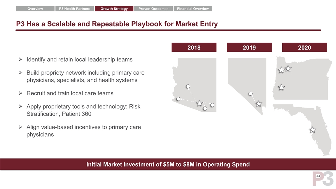 Overview P3 Health Partners Growth Strategy Proven Outcomes Financial Overview Examples Of Organic Growth: Arizona Connected Care Case Study Membership Growth Across Mature State Proven, Agile Model Allows for Rapid Scale Entered into provider partnership with Arizona Connected Care in 2018 that provided core market infrastructure and allowed us to expand our scalable model within the state Yavapai County 5 Our Arizona PCP network grew from ~300 to ~700 between AZ 2018-2019 Yuma County Expanded network enabled additional risk contracts 4 (1 contract to 4) and accelerated membership growth Pima County Cochise County 1 (~10K full risk lives to ~16K) 2 3 Santa Cruz County Shared savings lives obtained with Arizona Connected Care provided springboard for conversion to MA risk and direct contracting 43Overview P3 Health Partners Growth Strategy Proven Outcomes Financial Overview Examples Of Organic Growth: Arizona Connected Care Case Study Membership Growth Across Mature State Proven, Agile Model Allows for Rapid Scale Entered into provider partnership with Arizona Connected Care in 2018 that provided core market infrastructure and allowed us to expand our scalable model within the state Yavapai County 5 Our Arizona PCP network grew from ~300 to ~700 between AZ 2018-2019 Yuma County Expanded network enabled additional risk contracts 4 (1 contract to 4) and accelerated membership growth Pima County Cochise County 1 (~10K full risk lives to ~16K) 2 3 Santa Cruz County Shared savings lives obtained with Arizona Connected Care provided springboard for conversion to MA risk and direct contracting 43