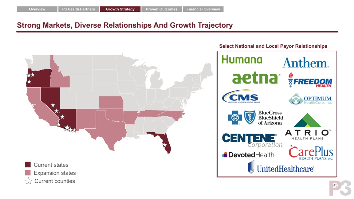 Overview P3 Health Partners Growth Strategy Proven Outcomes Financial Overview Strong Markets, Diverse Relationships And Growth Trajectory Select National and Local Payor Relationships Current states Expansion states Current counties 45Overview P3 Health Partners Growth Strategy Proven Outcomes Financial Overview Strong Markets, Diverse Relationships And Growth Trajectory Select National and Local Payor Relationships Current states Expansion states Current counties 45