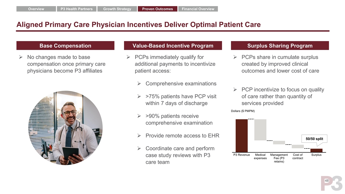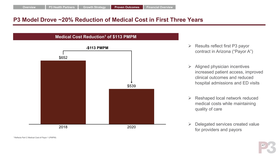Overview P3 Health Partners Growth Strategy Proven Outcomes Financial Overview P3 Model Drove ~20% Reduction of Medical Cost in First Three Years 1 Medical Cost Reduction of $113 PMPM ➢ Results reflect first P3 payor contract in Arizona (“Payor A”) ➢ Aligned physician incentives increased patient access, improved clinical outcomes and reduced hospital admissions and ED visits ➢ Reshaped local network reduced medical costs while maintaining quality of care ➢ Delegated services created value for providers and payors 1 Reflects Part C Medical Cost of Payor 1 (PMPM) 47Overview P3 Health Partners Growth Strategy Proven Outcomes Financial Overview P3 Model Drove ~20% Reduction of Medical Cost in First Three Years 1 Medical Cost Reduction of $113 PMPM ➢ Results reflect first P3 payor contract in Arizona (“Payor A”) ➢ Aligned physician incentives increased patient access, improved clinical outcomes and reduced hospital admissions and ED visits ➢ Reshaped local network reduced medical costs while maintaining quality of care ➢ Delegated services created value for providers and payors 1 Reflects Part C Medical Cost of Payor 1 (PMPM) 47