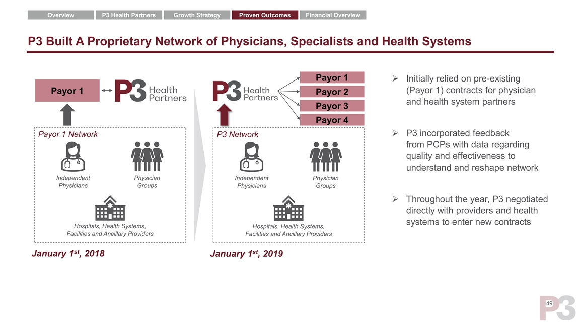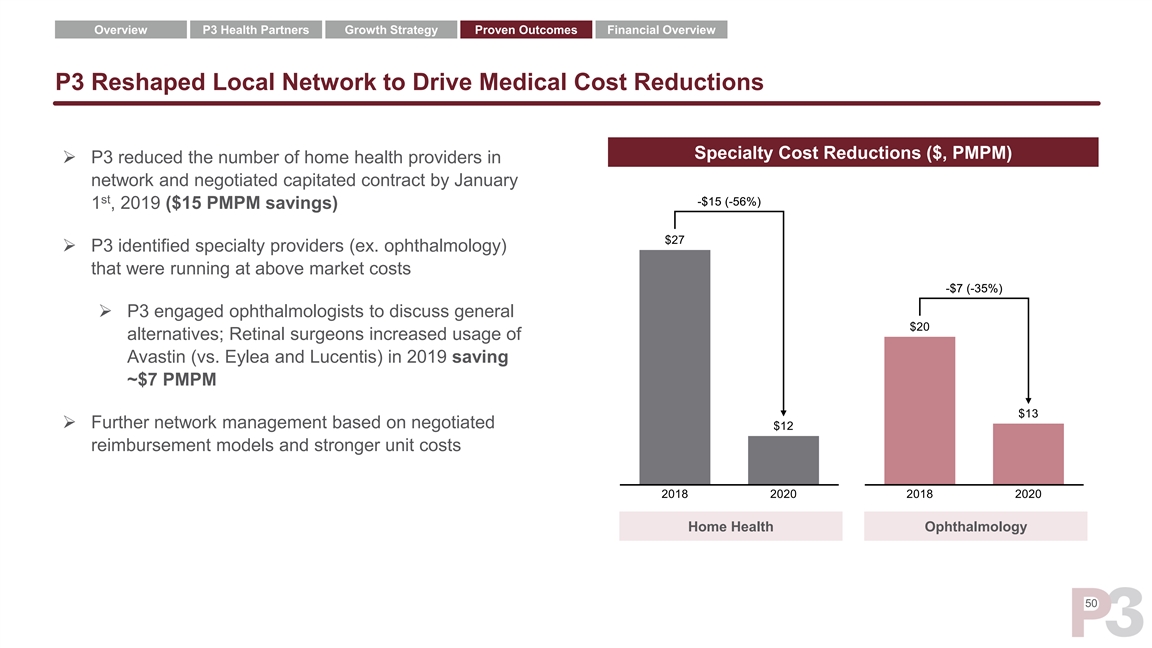 Overview P3 Health Partners Growth Strategy Proven Outcomes Financial Overview P3 Built A Proprietary Network of Physicians, Specialists and Health Systems Payor 1 ➢ Initially relied on pre-existing (Payor 1) contracts for physician Payor 1 Payor 2 and health system partners Payor 3 Payor 4 ➢ P3 incorporated feedback Payor 1 Network P3 Network from PCPs with data regarding quality and effectiveness to understand and reshape network Independent Physician Independent Physician Physicians Groups Physicians Groups ➢ Throughout the year, P3 negotiated directly with providers and health systems to enter new contracts Hospitals, Health Systems, Hospitals, Health Systems, Facilities and Ancillary Providers Facilities and Ancillary Providers st st January 1 , 2018 January 1 , 2019 49Overview P3 Health Partners Growth Strategy Proven Outcomes Financial Overview P3 Built A Proprietary Network of Physicians, Specialists and Health Systems Payor 1 ➢ Initially relied on pre-existing (Payor 1) contracts for physician Payor 1 Payor 2 and health system partners Payor 3 Payor 4 ➢ P3 incorporated feedback Payor 1 Network P3 Network from PCPs with data regarding quality and effectiveness to understand and reshape network Independent Physician Independent Physician Physicians Groups Physicians Groups ➢ Throughout the year, P3 negotiated directly with providers and health systems to enter new contracts Hospitals, Health Systems, Hospitals, Health Systems, Facilities and Ancillary Providers Facilities and Ancillary Providers st st January 1 , 2018 January 1 , 2019 49