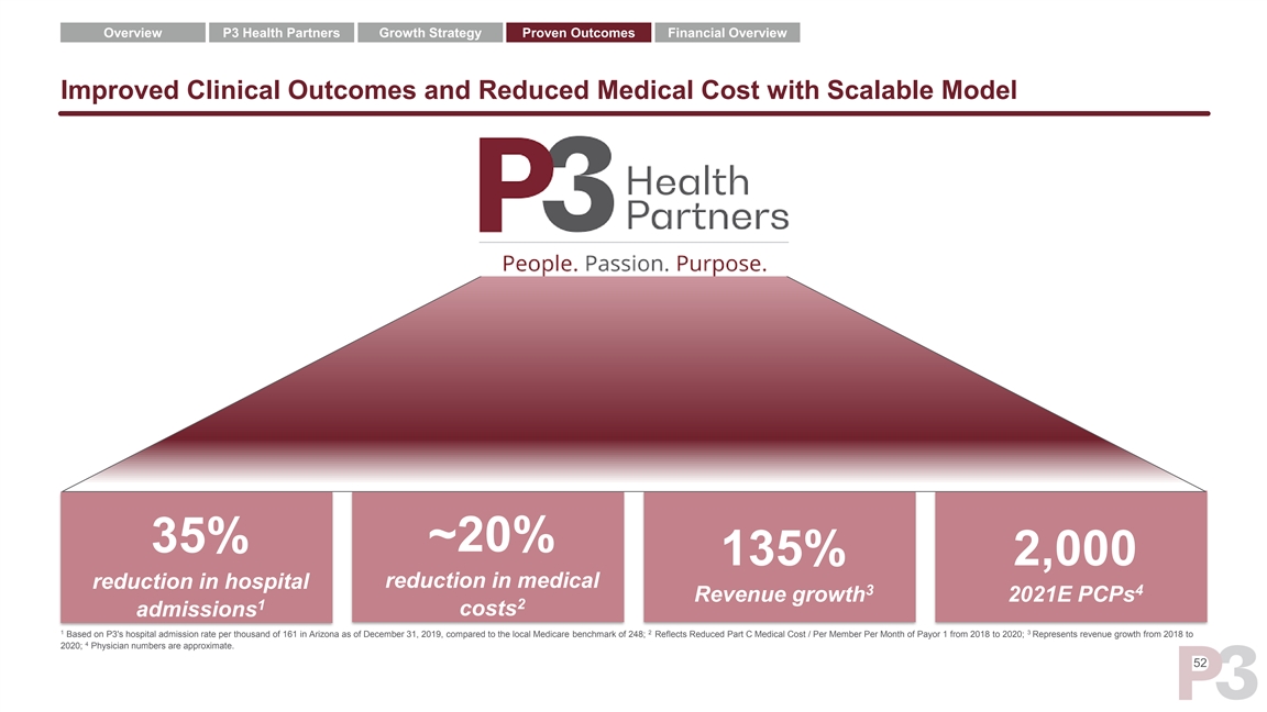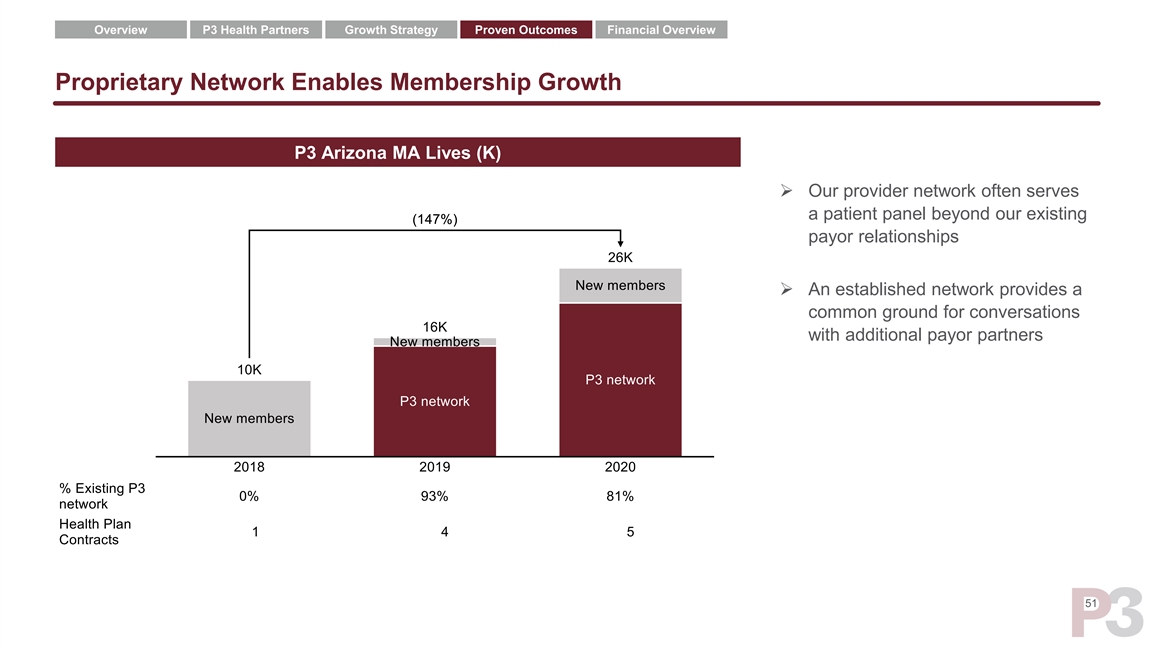 Overview P3 Health Partners Growth Strategy Proven Outcomes Financial Overview Proprietary Network Enables Membership Growth P3 Arizona MA Lives (K) ➢ Our provider network often serves a patient panel beyond our existing payor relationships ➢ An established network provides a common ground for conversations with additional payor partners 51Overview P3 Health Partners Growth Strategy Proven Outcomes Financial Overview Proprietary Network Enables Membership Growth P3 Arizona MA Lives (K) ➢ Our provider network often serves a patient panel beyond our existing payor relationships ➢ An established network provides a common ground for conversations with additional payor partners 51