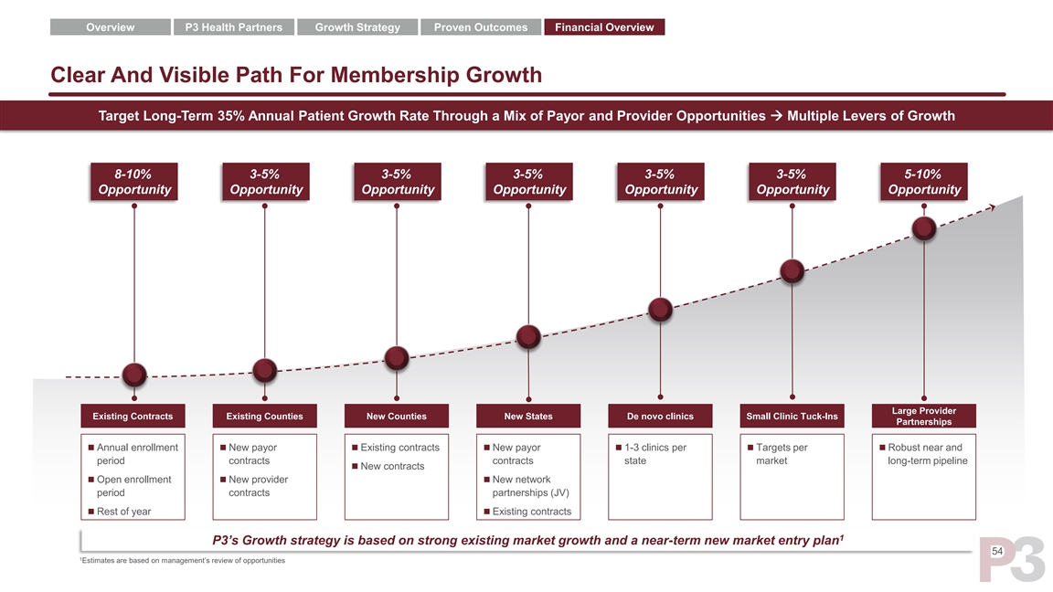 Overview P3 Health Partners Growth Strategy Proven Outcomes Financial Overview Clear And Visible Path For Membership Growth Target Long-Term 35% Annual Patient Growth Rate Through a Mix of Payor and Provider Opportunities → Multiple Levers of Growth 8-10% 3-5% 3-5% 3-5% 3-5% 3-5% 5-10% Opportunity Opportunity Opportunity Opportunity Opportunity Opportunity Opportunity Large Provider Existing Contracts Existing Counties New Counties New States De novo clinics Small Clinic Tuck-Ins Partnerships ◼ Annual enrollment ◼ New payor ◼ Existing contracts◼ New payor ◼ 1-3 clinics per ◼ Targets per ◼ Robust near and period contracts contracts state market long-term pipeline ◼ New contracts ◼ Open enrollment ◼ New provider ◼ New network period contracts partnerships (JV) ◼ Rest of year◼ Existing contracts 1 P3’s Growth strategy is based on strong existing market growth and a near-term new market entry plan 54 1 Estimates are based on management’s review of opportunities Overview P3 Health Partners Growth Strategy Proven Outcomes Financial Overview Clear And Visible Path For Membership Growth Target Long-Term 35% Annual Patient Growth Rate Through a Mix of Payor and Provider Opportunities → Multiple Levers of Growth 8-10% 3-5% 3-5% 3-5% 3-5% 3-5% 5-10% Opportunity Opportunity Opportunity Opportunity Opportunity Opportunity Opportunity Large Provider Existing Contracts Existing Counties New Counties New States De novo clinics Small Clinic Tuck-Ins Partnerships ◼ Annual enrollment ◼ New payor ◼ Existing contracts◼ New payor ◼ 1-3 clinics per ◼ Targets per ◼ Robust near and period contracts contracts state market long-term pipeline ◼ New contracts ◼ Open enrollment ◼ New provider ◼ New network period contracts partnerships (JV) ◼ Rest of year◼ Existing contracts 1 P3’s Growth strategy is based on strong existing market growth and a near-term new market entry plan 54 1 Estimates are based on management’s review of opportunities