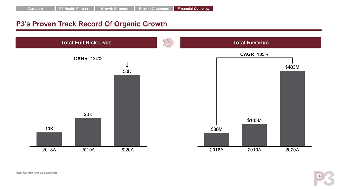 Overview P3 Health Partners Growth Strategy Proven Outcomes Financial Overview P3’s Proven Track Record Of Organic Growth Total Full Risk Lives Total Revenue Note: Patient numbers are approximate 55Overview P3 Health Partners Growth Strategy Proven Outcomes Financial Overview P3’s Proven Track Record Of Organic Growth Total Full Risk Lives Total Revenue Note: Patient numbers are approximate 55