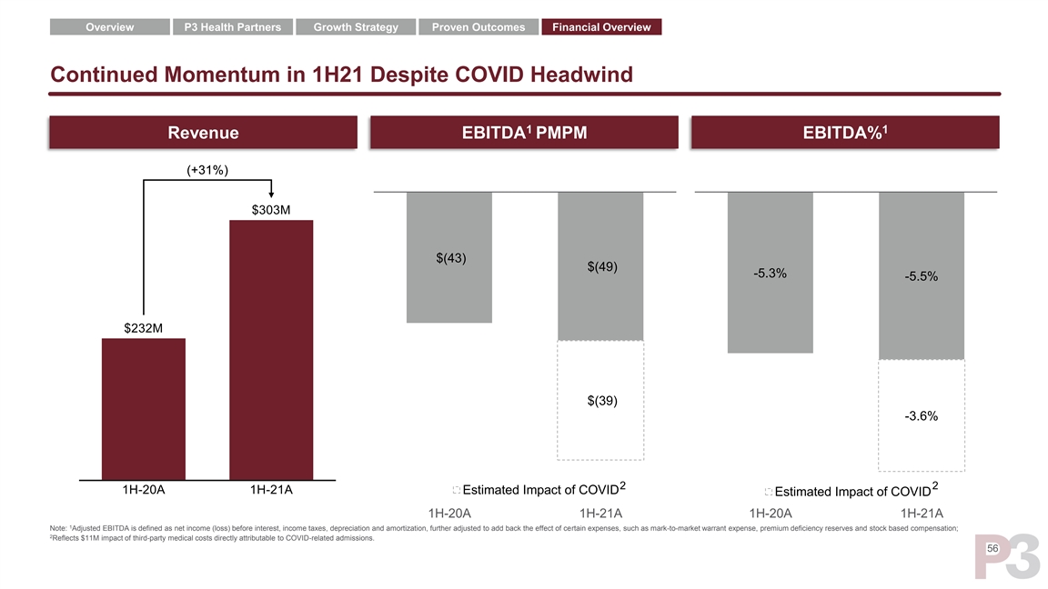 Overview P3 Health Partners Growth Strategy Proven Outcomes Financial Overview Continued Momentum in 1H21 Despite COVID Headwind 1 1 Revenue EBITDA PMPM EBITDA% $(43) $(49) -5.3% -5.5% $(39) -3.6% 2 2 Estimated Impact of COVID Estimated Impact of COVID 1H-20A 1H-21A 1H-20A 1H-21A 1 Note: Adjusted EBITDA is defined as net income (loss) before interest, income taxes, depreciation and amortization, further adjusted to add back the effect of certain expenses, such as mark-to-market warrant expense, premium deficiency reserves and stock based compensation; 2 Reflects $11M impact of third-party medical costs directly attributable to COVID-related admissions. 56