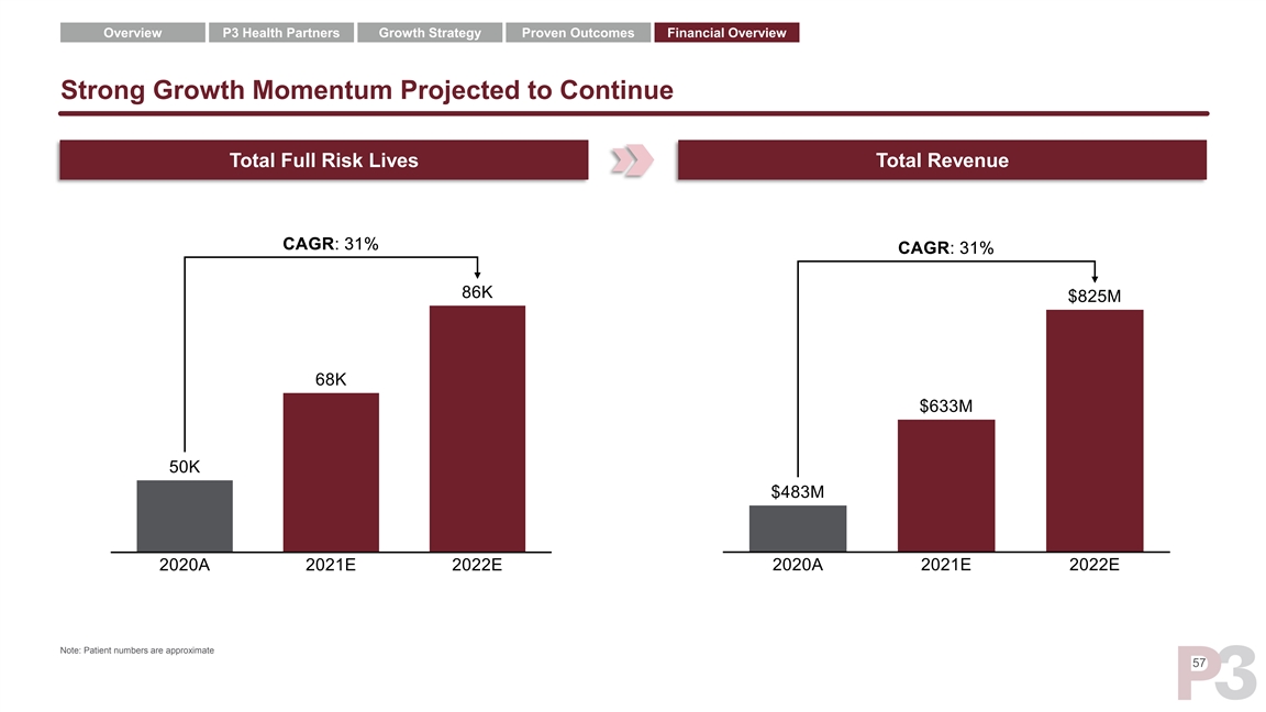 Overview P3 Health Partners Growth Strategy Proven Outcomes Financial Overview Strong Growth Momentum Projected to Continue Total Full Risk Lives Total Revenue Note: Patient numbers are approximate 57Overview P3 Health Partners Growth Strategy Proven Outcomes Financial Overview Strong Growth Momentum Projected to Continue Total Full Risk Lives Total Revenue Note: Patient numbers are approximate 57