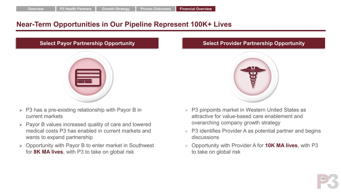 Overview P3 Health Partners Growth Strategy Proven Outcomes Financial Overview Near-Term Opportunities in Our Pipeline Represent 100K+ Lives Select Payor Partnership Opportunity Select Provider Partnership Opportunity ➢ P3 has a pre-existing relationship with Payor B in ➢ P3 pinpoints market in Western United States as current markets attractive for value-based care enablement and overarching company growth strategy ➢ Payor B values increased quality of care and lowered medical costs P3 has enabled in current markets and ➢ P3 identifies Provider A as potential partner and begins wants to expand partnership discussions ➢ Opportunity with Payor B to enter market in Southwest ➢ Opportunity with Provider A for 10K MA lives, with P3 for 8K MA lives, with P3 to take on global risk to take on global risk 58Overview P3 Health Partners Growth Strategy Proven Outcomes Financial Overview Near-Term Opportunities in Our Pipeline Represent 100K+ Lives Select Payor Partnership Opportunity Select Provider Partnership Opportunity ➢ P3 has a pre-existing relationship with Payor B in ➢ P3 pinpoints market in Western United States as current markets attractive for value-based care enablement and overarching company growth strategy ➢ Payor B values increased quality of care and lowered medical costs P3 has enabled in current markets and ➢ P3 identifies Provider A as potential partner and begins wants to expand partnership discussions ➢ Opportunity with Payor B to enter market in Southwest ➢ Opportunity with Provider A for 10K MA lives, with P3 for 8K MA lives, with P3 to take on global risk to take on global risk 58