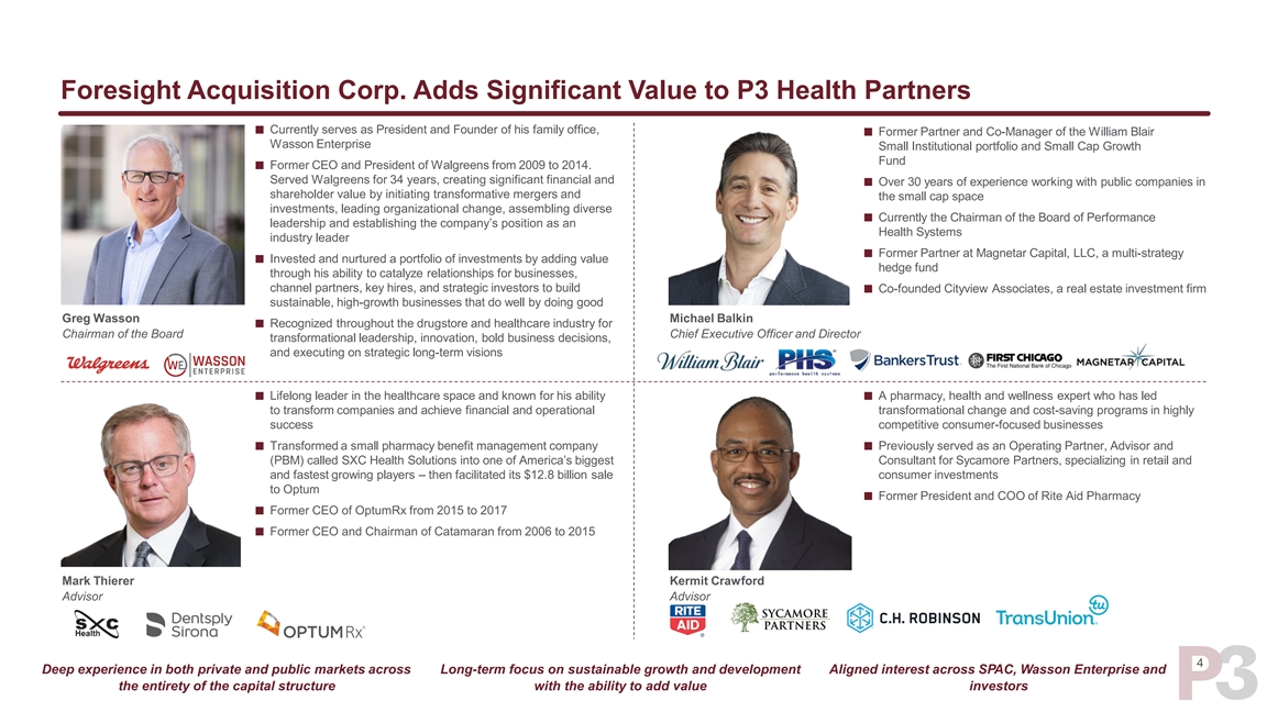 Disclaimer PARTICIPANTS IN THE SOLICITATION Foresight, P3 and certain of their respective directors, executive officers and other members of management and employees may, under SEC rules, be deemed to be participants in the solicitations of proxies from Foresight’s stockholders in connection with the proposed business combination. Information regarding the persons who may, under SEC rules, be deemed participants in the solicitation of Foresight’s stockholders in connection with the proposed business combination will be set forth in the Proxy Statement when it is filed with the SEC. You can find more information about Foresight’s directors and executive officers in Foresight’s Annual Report. Additional information regarding the participants in the proxy solicitation and a description of their direct and indirect interests will be included in the Proxy Statement when it becomes available. Stockholders, potential investors and other interested persons should read the Proxy Statement carefully when it becomes available before making any voting or investment decisions. You may obtain free copies of these documents from the sources indicated above. NO OFFER OR SOLICITATION This presentation does not constitute an offer to sell or the solicitation of an offer to buy any securities, or a solicitation of any vote or approval, nor shall there be any sale of securities in any jurisdiction in which such offer, solicitation or sale would be unlawful prior to registration or qualification under the securities laws of any such jurisdiction. TRADEMARKS This presentation contains trademarks, service marks, trade names and copyrights of P3, Foresight and other companies, which are the property of their respective owners. 3