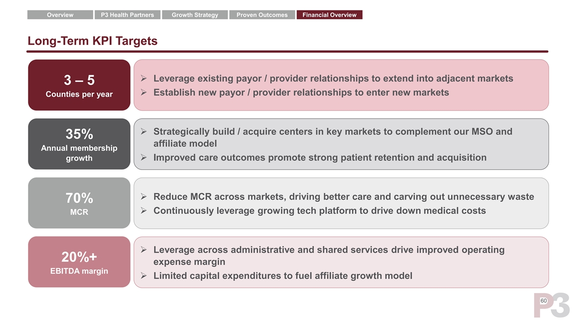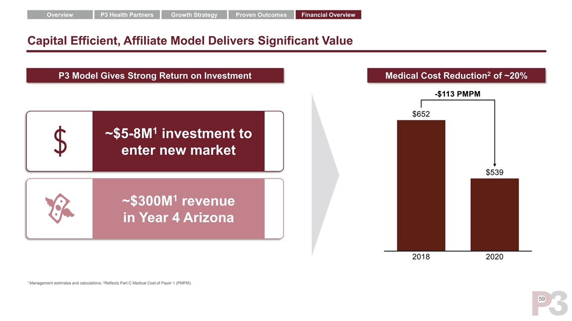 Overview P3 Health Partners Growth Strategy Proven Outcomes Financial Overview Capital Efficient, Affiliate Model Delivers Significant Value 2 P3 Model Gives Strong Return on Investment Medical Cost Reduction of ~20% 1 ~$5-8M investment to enter new market 1 ~$300M revenue in Year 4 Arizona 1 2 Management estimates and calculations; Reflects Part C Medical Cost of Payor 1 (PMPM). 59Overview P3 Health Partners Growth Strategy Proven Outcomes Financial Overview Capital Efficient, Affiliate Model Delivers Significant Value 2 P3 Model Gives Strong Return on Investment Medical Cost Reduction of ~20% 1 ~$5-8M investment to enter new market 1 ~$300M revenue in Year 4 Arizona 1 2 Management estimates and calculations; Reflects Part C Medical Cost of Payor 1 (PMPM). 59