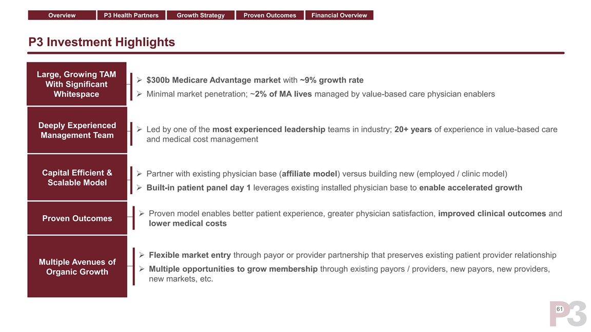 Overview P3 Health Partners Growth Strategy Proven Outcomes Financial Overview Long-Term KPI Targets ➢ Leverage existing payor / provider relationships to extend into adjacent markets 3 – 5 ➢ Establish new payor / provider relationships to enter new markets Counties per year ➢ Strategically build / acquire centers in key markets to complement our MSO and 35% affiliate model Annual membership ➢ Improved care outcomes promote strong patient retention and acquisition growth ➢ Reduce MCR across markets, driving better care and carving out unnecessary waste 70% ➢ Continuously leverage growing tech platform to drive down medical costs MCR ➢ Leverage across administrative and shared services drive improved operating 20%+ expense margin EBITDA margin ➢ Limited capital expenditures to fuel affiliate growth model 60Overview P3 Health Partners Growth Strategy Proven Outcomes Financial Overview Long-Term KPI Targets ➢ Leverage existing payor / provider relationships to extend into adjacent markets 3 – 5 ➢ Establish new payor / provider relationships to enter new markets Counties per year ➢ Strategically build / acquire centers in key markets to complement our MSO and 35% affiliate model Annual membership ➢ Improved care outcomes promote strong patient retention and acquisition growth ➢ Reduce MCR across markets, driving better care and carving out unnecessary waste 70% ➢ Continuously leverage growing tech platform to drive down medical costs MCR ➢ Leverage across administrative and shared services drive improved operating 20%+ expense margin EBITDA margin ➢ Limited capital expenditures to fuel affiliate growth model 60