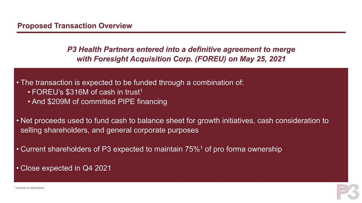 Proposed Transaction Overview P3 Health Partners entered into a definitive agreement to merge with Foresight Acquisition Corp. (FOREU) on May 25, 2021 • The transaction is expected to be funded through a combination of: 1 • FOREU’s $316M of cash in trust • And $209M of committed PIPE financing • Net proceeds used to fund cash to balance sheet for growth initiatives, cash consideration to selling shareholders, and general corporate purposes 1 • Current shareholders of P3 expected to maintain 75% of pro forma ownership • Close expected in Q4 2021 1 Assumes no redemptions 63Proposed Transaction Overview P3 Health Partners entered into a definitive agreement to merge with Foresight Acquisition Corp. (FOREU) on May 25, 2021 • The transaction is expected to be funded through a combination of: 1 • FOREU’s $316M of cash in trust • And $209M of committed PIPE financing • Net proceeds used to fund cash to balance sheet for growth initiatives, cash consideration to selling shareholders, and general corporate purposes 1 • Current shareholders of P3 expected to maintain 75% of pro forma ownership • Close expected in Q4 2021 1 Assumes no redemptions 63