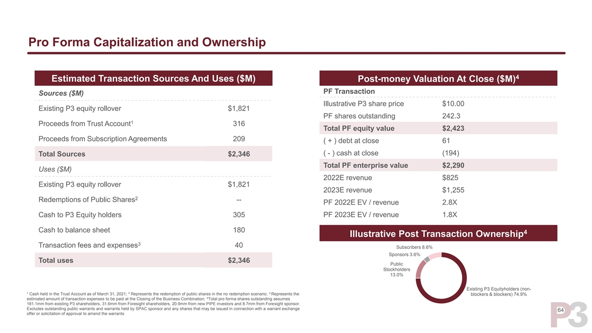 Pro Forma Capitalization and Ownership 4 Estimated Transaction Sources And Uses ($M) Post-money Valuation At Close ($M) PF Transaction Sources ($M) Illustrative P3 share price $10.00 Existing P3 equity rollover $1,821 PF shares outstanding 242.3 1 Proceeds from Trust Account 316 Total PF equity value $2,423 Proceeds from Subscription Agreements 209 ( + ) debt at close 61 ( - ) cash at close (194) Total Sources $2,346 Total PF enterprise value $2,290 Uses ($M) 2022E revenue $825 Existing P3 equity rollover $1,821 2023E revenue $1,255 2 Redemptions of Public Shares -- PF 2022E EV / revenue 2.8X Cash to P3 Equity holders 305 PF 2023E EV / revenue 1.8X Cash to balance sheet 180 4 Illustrative Post Transaction Ownership 3 Transaction fees and expenses 40 Subscribers 8.6% Sponsors 3.6% Total uses $2,346 Public Stockholders 13.0% Existing P3 Equityholders (non- 3 ¹ Cash held in the Trust Account as of March 31, 2021; ² Represents the redemption of public shares in the no redemption scenario; Represents the blockers & blockers) 74.9% 4 estimated amount of transaction expenses to be paid at the Closing of the Business Combination; Total pro forma shares outstanding assumes 181.1mm from existing P3 shareholders, 31.6mm from Foresight shareholders, 20.9mm from new PIPE investors and 8.7mm from Foresight sponsor. Excludes outstanding public warrants and warrants held by SPAC sponsor and any shares that may be issued in connection with a warrant exchange 64 offer or solicitation of approval to amend the warrantsPro Forma Capitalization and Ownership 4 Estimated Transaction Sources And Uses ($M) Post-money Valuation At Close ($M) PF Transaction Sources ($M) Illustrative P3 share price $10.00 Existing P3 equity rollover $1,821 PF shares outstanding 242.3 1 Proceeds from Trust Account 316 Total PF equity value $2,423 Proceeds from Subscription Agreements 209 ( + ) debt at close 61 ( - ) cash at close (194) Total Sources $2,346 Total PF enterprise value $2,290 Uses ($M) 2022E revenue $825 Existing P3 equity rollover $1,821 2023E revenue $1,255 2 Redemptions of Public Shares -- PF 2022E EV / revenue 2.8X Cash to P3 Equity holders 305 PF 2023E EV / revenue 1.8X Cash to balance sheet 180 4 Illustrative Post Transaction Ownership 3 Transaction fees and expenses 40 Subscribers 8.6% Sponsors 3.6% Total uses $2,346 Public Stockholders 13.0% Existing P3 Equityholders (non- 3 ¹ Cash held in the Trust Account as of March 31, 2021; ² Represents the redemption of public shares in the no redemption scenario; Represents the blockers & blockers) 74.9% 4 estimated amount of transaction expenses to be paid at the Closing of the Business Combination; Total pro forma shares outstanding assumes 181.1mm from existing P3 shareholders, 31.6mm from Foresight shareholders, 20.9mm from new PIPE investors and 8.7mm from Foresight sponsor. Excludes outstanding public warrants and warrants held by SPAC sponsor and any shares that may be issued in connection with a warrant exchange 64 offer or solicitation of approval to amend the warrants
