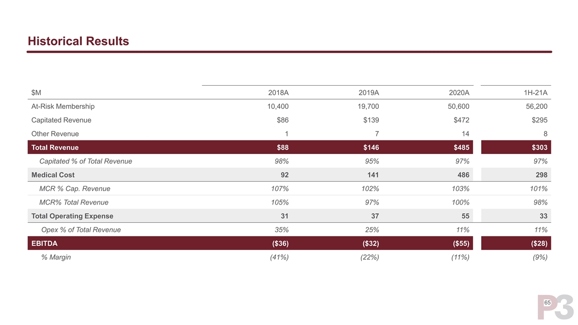 Historical Results $M 2018A 2019A 2020A 1H-21A At-Risk Membership 10,400 19,700 50,600 56,200 Capitated Revenue $86 $139 $472 $295 Other Revenue 1 7 14 8 Total Revenue $88 $146 $485 $303 Capitated % of Total Revenue 98% 95% 97% 97% Medical Cost 92 141 486 298 MCR % Cap. Revenue 107% 102% 103% 101% MCR% Total Revenue 105% 97% 100% 98% Total Operating Expense 31 37 55 33 Opex % of Total Revenue 35% 25% 11% 11% EBITDA ($36) ($32) ($55) ($28) % Margin (41%) (22%) (11%) (9%) 65Historical Results $M 2018A 2019A 2020A 1H-21A At-Risk Membership 10,400 19,700 50,600 56,200 Capitated Revenue $86 $139 $472 $295 Other Revenue 1 7 14 8 Total Revenue $88 $146 $485 $303 Capitated % of Total Revenue 98% 95% 97% 97% Medical Cost 92 141 486 298 MCR % Cap. Revenue 107% 102% 103% 101% MCR% Total Revenue 105% 97% 100% 98% Total Operating Expense 31 37 55 33 Opex % of Total Revenue 35% 25% 11% 11% EBITDA ($36) ($32) ($55) ($28) % Margin (41%) (22%) (11%) (9%) 65