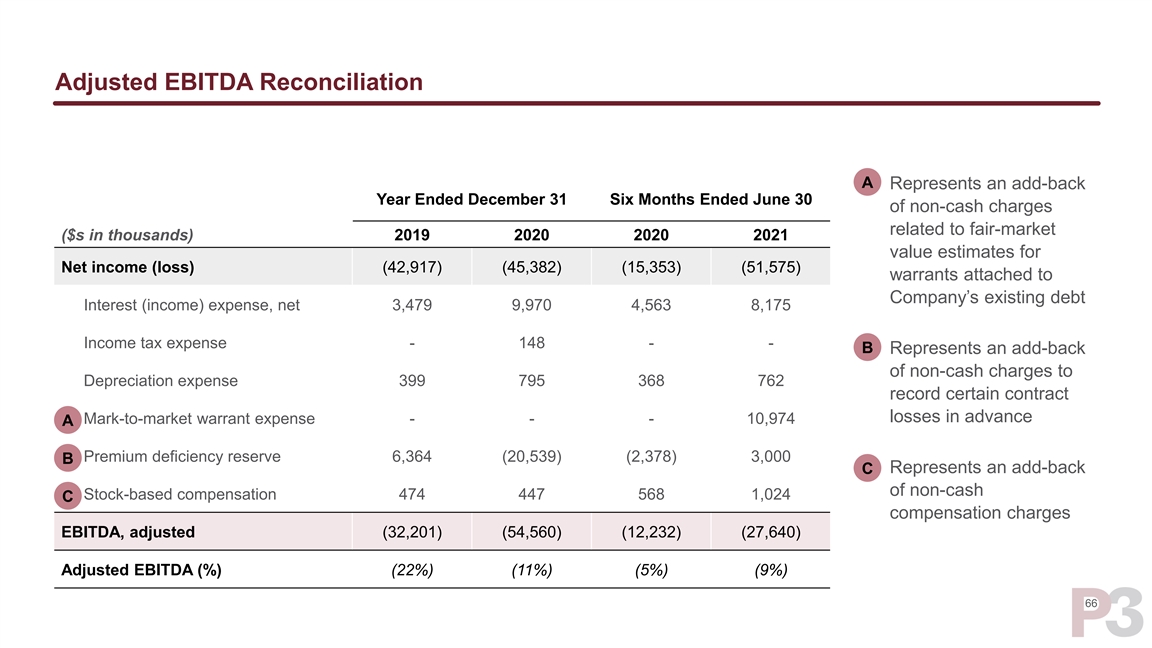 Adjusted EBITDA Reconciliation A ➢ Represents an add-back Year Ended December 31 Six Months Ended June 30 of non-cash charges related to fair-market ($s in thousands) 2019 2020 2020 2021 value estimates for Net income (loss) (42,917) (45,382) (15,353) (51,575) warrants attached to Company’s existing debt Interest (income) expense, net 3,479 9,970 4,563 8,175 Income tax expense - 148 - - B ➢ Represents an add-back of non-cash charges to Depreciation expense 399 795 368 762 record certain contract losses in advance Mark-to-market warrant expense - - - 10,974 A Premium deficiency reserve 6,364 (20,539) (2,378) 3,000 B ➢ Represents an add-back C of non-cash Stock-based compensation 474 447 568 1,024 C compensation charges EBITDA, adjusted (32,201) (54,560) (12,232) (27,640) Adjusted EBITDA (%) (22%) (11%) (5%) (9%) 66Adjusted EBITDA Reconciliation A ➢ Represents an add-back Year Ended December 31 Six Months Ended June 30 of non-cash charges related to fair-market ($s in thousands) 2019 2020 2020 2021 value estimates for Net income (loss) (42,917) (45,382) (15,353) (51,575) warrants attached to Company’s existing debt Interest (income) expense, net 3,479 9,970 4,563 8,175 Income tax expense - 148 - - B ➢ Represents an add-back of non-cash charges to Depreciation expense 399 795 368 762 record certain contract losses in advance Mark-to-market warrant expense - - - 10,974 A Premium deficiency reserve 6,364 (20,539) (2,378) 3,000 B ➢ Represents an add-back C of non-cash Stock-based compensation 474 447 568 1,024 C compensation charges EBITDA, adjusted (32,201) (54,560) (12,232) (27,640) Adjusted EBITDA (%) (22%) (11%) (5%) (9%) 66