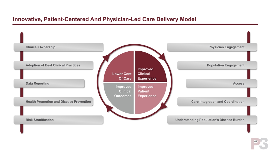 Innovative, Patient-Centered And Physician-Led Care Delivery Model Clinical Ownership Physician Engagement Adoption of Best Clinical Practices Population Engagement Improved Lower Cost Clinical Experience Of Care Data Reporting Access Improved Improved Clinical Patient Outcomes Experience Health Promotion and Disease Prevention Care Integration and Coordination Risk Stratification Understanding Population’s Disease Burden 67Innovative, Patient-Centered And Physician-Led Care Delivery Model Clinical Ownership Physician Engagement Adoption of Best Clinical Practices Population Engagement Improved Lower Cost Clinical Experience Of Care Data Reporting Access Improved Improved Clinical Patient Outcomes Experience Health Promotion and Disease Prevention Care Integration and Coordination Risk Stratification Understanding Population’s Disease Burden 67