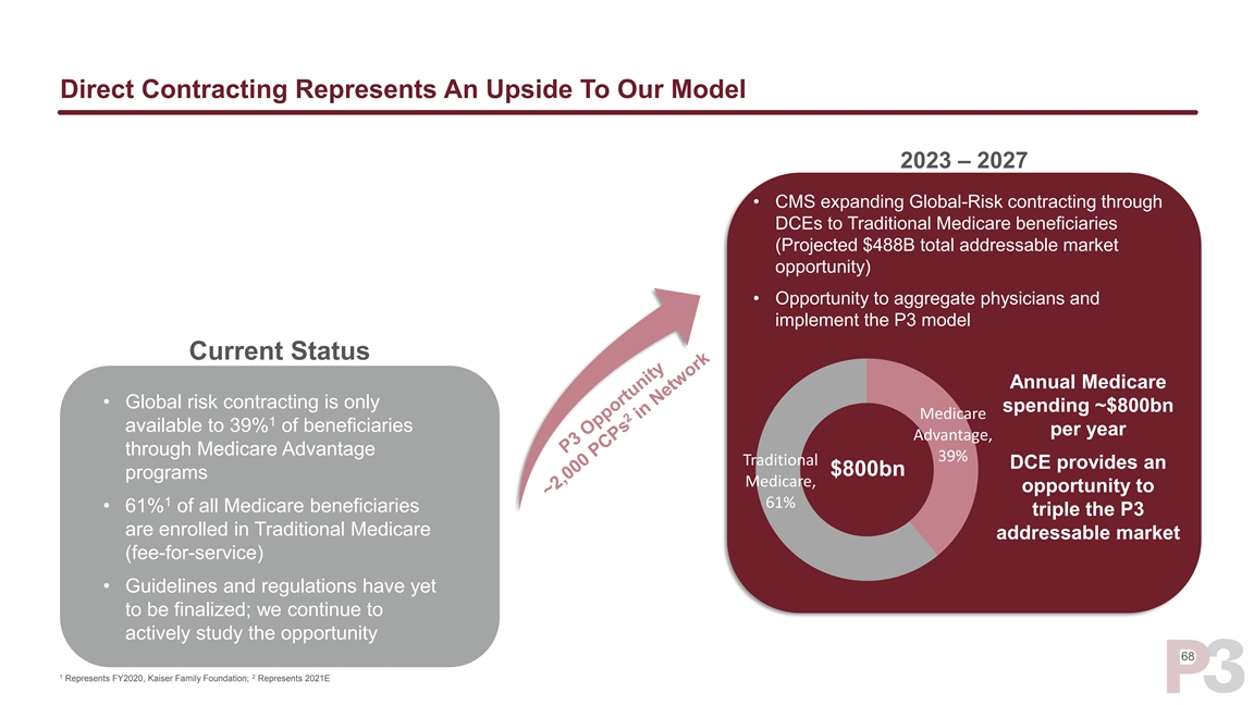 Direct Contracting Represents An Upside To Our Model 2023 – 2027 • CMS expanding Global-Risk contracting through DCEs to Traditional Medicare beneficiaries (Projected $488B total addressable market opportunity) • Opportunity to aggregate physicians and implement the P3 model Current Status Annual Medicare • Global risk contracting is only spending ~$800bn Medicare 1 available to 39% of beneficiaries per year Advantage, through Medicare Advantage 39% Traditional DCE provides an $800bn programs Medicare, opportunity to 1 61% • 61% of all Medicare beneficiaries triple the P3 are enrolled in Traditional Medicare addressable market (fee-for-service) • Guidelines and regulations have yet to be finalized; we continue to actively study the opportunity 68 1 2 Represents FY2020, Kaiser Family Foundation; Represents 2021EDirect Contracting Represents An Upside To Our Model 2023 – 2027 • CMS expanding Global-Risk contracting through DCEs to Traditional Medicare beneficiaries (Projected $488B total addressable market opportunity) • Opportunity to aggregate physicians and implement the P3 model Current Status Annual Medicare • Global risk contracting is only spending ~$800bn Medicare 1 available to 39% of beneficiaries per year Advantage, through Medicare Advantage 39% Traditional DCE provides an $800bn programs Medicare, opportunity to 1 61% • 61% of all Medicare beneficiaries triple the P3 are enrolled in Traditional Medicare addressable market (fee-for-service) • Guidelines and regulations have yet to be finalized; we continue to actively study the opportunity 68 1 2 Represents FY2020, Kaiser Family Foundation; Represents 2021E