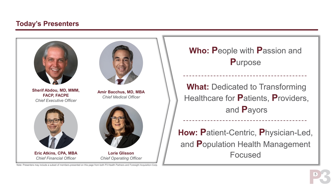 Foresight Acquisition Corp. Adds Significant Value to P3 Health Partners ■ Currently serves as President and Founder of his family office, ■ Former Partner and Co-Manager of the William Blair Wasson Enterprise Small Institutional portfolio and Small Cap Growth Fund ■ Former CEO and President of Walgreens from 2009 to 2014. Served Walgreens for 34 years, creating significant financial and ■ Over 30 years of experience working with public companies in shareholder value by initiating transformative mergers and the small cap space investments, leading organizational change, assembling diverse ■ Currently the Chairman of the Board of Performance leadership and establishing the company’s position as an Health Systems industry leader ■ Former Partner at Magnetar Capital, LLC, a multi-strategy ■ Invested and nurtured a portfolio of investments by adding value hedge fund through his ability to catalyze relationships for businesses, channel partners, key hires, and strategic investors to build■ Co-founded Cityview Associates, a real estate investment firm sustainable, high-growth businesses that do well by doing good Greg Wasson Michael Balkin ■ Recognized throughout the drugstore and healthcare industry for Chairman of the Board Chief Executive Officer and Director transformational leadership, innovation, bold business decisions, and executing on strategic long-term visions ■ Lifelong leader in the healthcare space and known for his ability■ A pharmacy, health and wellness expert who has led to transform companies and achieve financial and operational transformational change and cost-saving programs in highly success competitive consumer-focused businesses ■ Transformed a small pharmacy benefit management company■ Previously served as an Operating Partner, Advisor and (PBM) called SXC Health Solutions into one of America’s biggest Consultant for Sycamore Partners, specializing in retail and and fastest growing players – then facilitated its $12.8 billion sale consumer investments to Optum ■ Former President and COO of Rite Aid Pharmacy ■ Former CEO of OptumRx from 2015 to 2017 ■ Former CEO and Chairman of Catamaran from 2006 to 2015 Mark Thierer Kermit Crawford Advisor Advisor 4 Deep experience in both private and public markets across Long-term focus on sustainable growth and development Aligned interest across SPAC, Wasson Enterprise and the entirety of the capital structure with the ability to add value investorsForesight Acquisition Corp. Adds Significant Value to P3 Health Partners ■ Currently serves as President and Founder of his family office, ■ Former Partner and Co-Manager of the William Blair Wasson Enterprise Small Institutional portfolio and Small Cap Growth Fund ■ Former CEO and President of Walgreens from 2009 to 2014. Served Walgreens for 34 years, creating significant financial and ■ Over 30 years of experience working with public companies in shareholder value by initiating transformative mergers and the small cap space investments, leading organizational change, assembling diverse ■ Currently the Chairman of the Board of Performance leadership and establishing the company’s position as an Health Systems industry leader ■ Former Partner at Magnetar Capital, LLC, a multi-strategy ■ Invested and nurtured a portfolio of investments by adding value hedge fund through his ability to catalyze relationships for businesses, channel partners, key hires, and strategic investors to build■ Co-founded Cityview Associates, a real estate investment firm sustainable, high-growth businesses that do well by doing good Greg Wasson Michael Balkin ■ Recognized throughout the drugstore and healthcare industry for Chairman of the Board Chief Executive Officer and Director transformational leadership, innovation, bold business decisions, and executing on strategic long-term visions ■ Lifelong leader in the healthcare space and known for his ability■ A pharmacy, health and wellness expert who has led to transform companies and achieve financial and operational transformational change and cost-saving programs in highly success competitive consumer-focused businesses ■ Transformed a small pharmacy benefit management company■ Previously served as an Operating Partner, Advisor and (PBM) called SXC Health Solutions into one of America’s biggest Consultant for Sycamore Partners, specializing in retail and and fastest growing players – then facilitated its $12.8 billion sale consumer investments to Optum ■ Former President and COO of Rite Aid Pharmacy ■ Former CEO of OptumRx from 2015 to 2017 ■ Former CEO and Chairman of Catamaran from 2006 to 2015 Mark Thierer Kermit Crawford Advisor Advisor 4 Deep experience in both private and public markets across Long-term focus on sustainable growth and development Aligned interest across SPAC, Wasson Enterprise and the entirety of the capital structure with the ability to add value investors