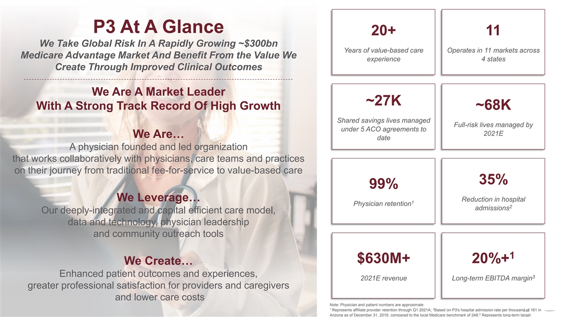 P3 At A Glance 20+ 11 We Take Global Risk In A Rapidly Growing ~$300bn Years of value-based care Operates in 11 markets across Medicare Advantage Market And Benefit From the Value We experience 4 states Create Through Improved Clinical Outcomes We Are A Market Leader ~27K With A Strong Track Record Of High Growth ~68K Shared savings lives managed Full-risk lives managed by under 5 ACO agreements to 2021E We Are… date A physician founded and led organization that works collaboratively with physicians, care teams and practices on their journey from traditional fee-for-service to value-based care 35% 99% We Leverage… Reduction in hospital 1 Physician retention 2 admissions Our deeply-integrated and capital efficient care model, data and technology, physician leadership and community outreach tools 1 $630M+ 20%+ We Create… Enhanced patient outcomes and experiences, 3 2021E revenue Long-term EBITDA margin greater professional satisfaction for providers and caregivers 7 and lower care costs Note: Physician and patient numbers are approximate 1 2 Represents affiliate provider retention through Q1 2021A; Based on P3's hospital admission rate per thousand of 161 in 3 Arizona as of December 31, 2019, compared to the local Medicare benchmark of 248; Represents long-term targetP3 At A Glance 20+ 11 We Take Global Risk In A Rapidly Growing ~$300bn Years of value-based care Operates in 11 markets across Medicare Advantage Market And Benefit From the Value We experience 4 states Create Through Improved Clinical Outcomes We Are A Market Leader ~27K With A Strong Track Record Of High Growth ~68K Shared savings lives managed Full-risk lives managed by under 5 ACO agreements to 2021E We Are… date A physician founded and led organization that works collaboratively with physicians, care teams and practices on their journey from traditional fee-for-service to value-based care 35% 99% We Leverage… Reduction in hospital 1 Physician retention 2 admissions Our deeply-integrated and capital efficient care model, data and technology, physician leadership and community outreach tools 1 $630M+ 20%+ We Create… Enhanced patient outcomes and experiences, 3 2021E revenue Long-term EBITDA margin greater professional satisfaction for providers and caregivers 7 and lower care costs Note: Physician and patient numbers are approximate 1 2 Represents affiliate provider retention through Q1 2021A; Based on P3's hospital admission rate per thousand of 161 in 3 Arizona as of December 31, 2019, compared to the local Medicare benchmark of 248; Represents long-term target