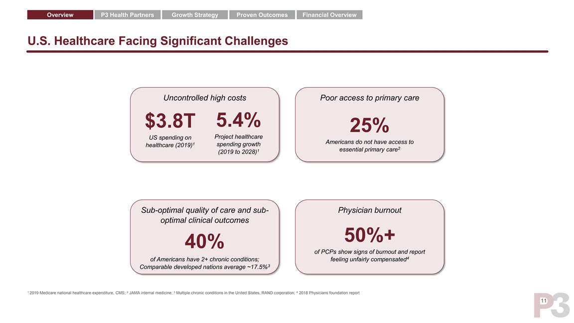 Overview P3 Health Partners Growth Strategy Proven Outcomes Financial Overview P3 Investment Highlights Large, Growing TAM With Significant Whitespace Deeply Experienced Management Team Capital Efficient & Scalable Model Proven Outcomes Multiple Avenues of Organic Growth 10Overview P3 Health Partners Growth Strategy Proven Outcomes Financial Overview P3 Investment Highlights Large, Growing TAM With Significant Whitespace Deeply Experienced Management Team Capital Efficient & Scalable Model Proven Outcomes Multiple Avenues of Organic Growth 10