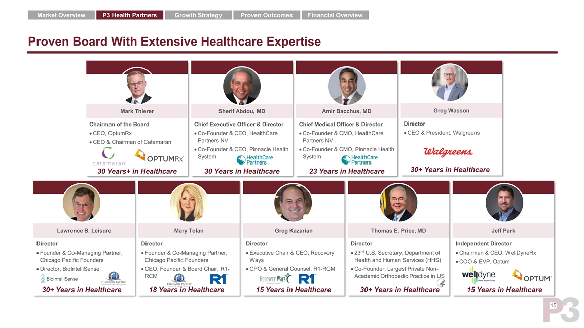 Market Overview P3 Health Partners Growth Strategy Proven Outcomes Financial Overview Proven Board With Extensive Healthcare Expertise Greg Wasson Mark Thierer Sherif Abdou, MD Amir Bacchus, MD Director Chairman of the Board Chief Executive Officer & Director Chief Medical Officer & Director • CEO & President, Walgreens • CEO, OptumRx• Co-Founder & CEO, HealthCare • Co-Founder & CMO, HealthCare Partners NV Partners NV • CEO & Chairman of Catamaran • Co-Founder & CEO, Pinnacle Health • Co-Founder & CMO, Pinnacle Health System System 30+ Years in Healthcare 30 Years+ in Healthcare 30 Years in Healthcare 23 Years in Healthcare Lawrence B. Leisure Mary Tolan Greg Kazarian Thomas E. Price, MD Jeff Park Director Director Director Director Independent Director rd • Founder & Co-Managing Partner, • Founder & Co-Managing Partner, • Executive Chair & CEO, Recovery • 23 U.S. Secretary, Department of• Chairman & CEO, WellDyneRx Ways Health and Human Services (HHS) Chicago Pacific Founders Chicago Pacific Founders • COO & EVP, Optum • Director, BioIntelliSense• CEO, Founder & Board Chair, R1-• CPO & General Counsel, R1-RCM• Co-Founder, Largest Private Non- Academic Orthopedic Practice in US RCM 30+ Years in Healthcare 18 Years in Healthcare 15 Years in Healthcare 30+ Years in Healthcare 15 Years in Healthcare 15Market Overview P3 Health Partners Growth Strategy Proven Outcomes Financial Overview Proven Board With Extensive Healthcare Expertise Greg Wasson Mark Thierer Sherif Abdou, MD Amir Bacchus, MD Director Chairman of the Board Chief Executive Officer & Director Chief Medical Officer & Director • CEO & President, Walgreens • CEO, OptumRx• Co-Founder & CEO, HealthCare • Co-Founder & CMO, HealthCare Partners NV Partners NV • CEO & Chairman of Catamaran • Co-Founder & CEO, Pinnacle Health • Co-Founder & CMO, Pinnacle Health System System 30+ Years in Healthcare 30 Years+ in Healthcare 30 Years in Healthcare 23 Years in Healthcare Lawrence B. Leisure Mary Tolan Greg Kazarian Thomas E. Price, MD Jeff Park Director Director Director Director Independent Director rd • Founder & Co-Managing Partner, • Founder & Co-Managing Partner, • Executive Chair & CEO, Recovery • 23 U.S. Secretary, Department of• Chairman & CEO, WellDyneRx Ways Health and Human Services (HHS) Chicago Pacific Founders Chicago Pacific Founders • COO & EVP, Optum • Director, BioIntelliSense• CEO, Founder & Board Chair, R1-• CPO & General Counsel, R1-RCM• Co-Founder, Largest Private Non- Academic Orthopedic Practice in US RCM 30+ Years in Healthcare 18 Years in Healthcare 15 Years in Healthcare 30+ Years in Healthcare 15 Years in Healthcare 15