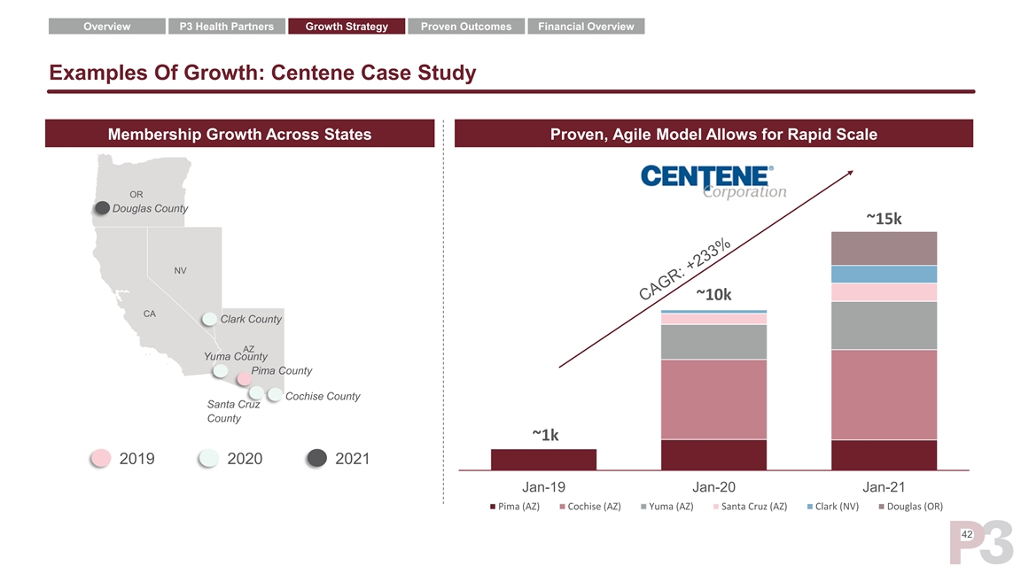 Overview P3 Health Partners Growth Strategy Proven Outcomes Financial Overview Examples Of Growth: Centene Case Study Proven Agile P3 Model Allows for Rapid Scale Membership Growth Across States Proven, Agile Model Allows for Rapid Scale OR Douglas County ~15k NV ~10k CA Clark County AZ Yuma County Pima County Cochise County Santa Cruz County ~1k 2019 2020 2021 Jan-19 Jan-20 Jan-21 Pima (AZ) Cochise (AZ) Yuma (AZ) Santa Cruz (AZ) Clark (NV) Douglas (OR) 42Overview P3 Health Partners Growth Strategy Proven Outcomes Financial Overview Examples Of Growth: Centene Case Study Proven Agile P3 Model Allows for Rapid Scale Membership Growth Across States Proven, Agile Model Allows for Rapid Scale OR Douglas County ~15k NV ~10k CA Clark County AZ Yuma County Pima County Cochise County Santa Cruz County ~1k 2019 2020 2021 Jan-19 Jan-20 Jan-21 Pima (AZ) Cochise (AZ) Yuma (AZ) Santa Cruz (AZ) Clark (NV) Douglas (OR) 42
