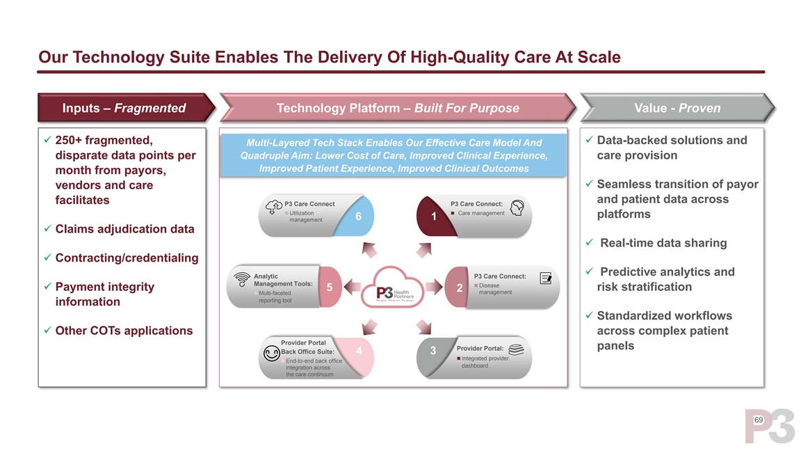 Our Technology Suite Enables The Delivery Of High-Quality Care At Scale Inputs – Fragmented Technology Platform – Built For Purpose Value - Proven ✓ 250+ fragmented, ✓ Data-backed solutions and Multi-Layered Tech Stack Enables Our Effective Care Model And Quadruple Aim: Lower Cost of Care, Improved Clinical Experience, disparate data points per care provision Improved Patient Experience, Improved Clinical Outcomes month from payors, ✓ Seamless transition of payor vendors and care and patient data across facilitates P3 Care Connect P3 Care Connect: ◼ Utilization ◼ Care management platforms 6 1 management ✓ Claims adjudication data ✓ Real-time data sharing ✓ Contracting/credentialing ✓ Predictive analytics and Analytic P3 Care Connect: Management Tools: ◼ Disease ✓ Payment integrity 5 risk stratification 2 management ◼ Multi-faceted reporting tool information ✓ Standardized workflows ✓ Other COTs applications across complex patient Provider Portal panels Provider Portal: Back Office Suite: 4 3 ◼ Integrated provider ◼ End-to-end back office dashboard integration across the care continuum 69Our Technology Suite Enables The Delivery Of High-Quality Care At Scale Inputs – Fragmented Technology Platform – Built For Purpose Value - Proven ✓ 250+ fragmented, ✓ Data-backed solutions and Multi-Layered Tech Stack Enables Our Effective Care Model And Quadruple Aim: Lower Cost of Care, Improved Clinical Experience, disparate data points per care provision Improved Patient Experience, Improved Clinical Outcomes month from payors, ✓ Seamless transition of payor vendors and care and patient data across facilitates P3 Care Connect P3 Care Connect: ◼ Utilization ◼ Care management platforms 6 1 management ✓ Claims adjudication data ✓ Real-time data sharing ✓ Contracting/credentialing ✓ Predictive analytics and Analytic P3 Care Connect: Management Tools: ◼ Disease ✓ Payment integrity 5 risk stratification 2 management ◼ Multi-faceted reporting tool information ✓ Standardized workflows ✓ Other COTs applications across complex patient Provider Portal panels Provider Portal: Back Office Suite: 4 3 ◼ Integrated provider ◼ End-to-end back office dashboard integration across the care continuum 69